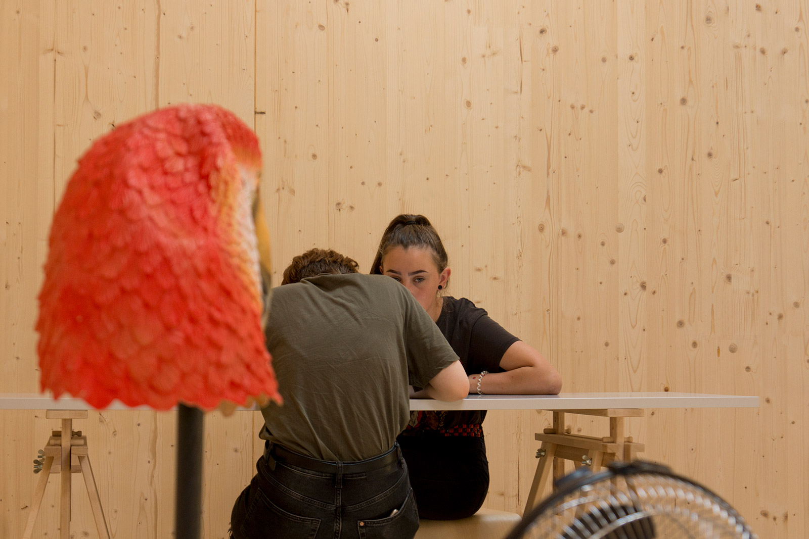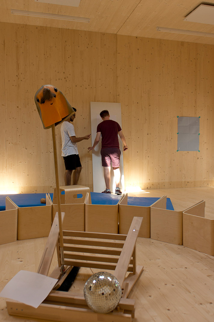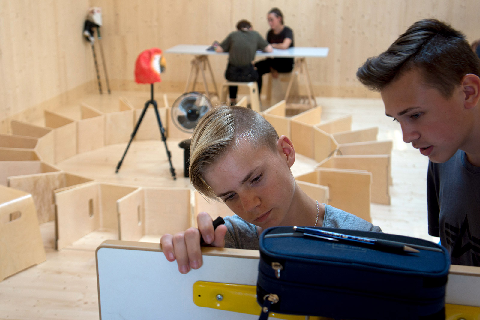 Das erste Mal im „Künstlerzimmer“ fragte uns Jan Lotter: „Habt ihr schon mal davon gehört, dass jedes Tier die Welt anders wahrnimmt?“ Wir fragten uns, was diese Frage bedeuten sollte und was dies mit unserem Unterricht zu tun hätte. Dann bekamen wir unsere Aufgaben: Wir sollten in jeweils Zweiergruppen zu einem der ausgehangenen Zeichenblätter gehen. Dort sollte eine der beiden Personen einen Stift nehmen und sich dem Blatt zuwenden. Diejenigen, die vor dem Blatt standen, durften sich nun nicht mehr umdrehen. Während Jan Lotter etwas in der Mitte des Raumes aufbaute (bestehend u.a aus einem Besen und einer Tiermaske), sollten alle warten, bis er fertig war. Der*die jeweilige Partner*in sollte dem anderen das Aufgebaute beschreiben und der*die vor dem Blatt stand, sollte dies zeichnen. Man zeichnete nach Angaben, wobei man die Sicht seines*seiner Partner*in hörte, während man dies wiederum mit seiner eigenen Sicht vermischte. Das Ziel des Ganzen war, dass man mal sehen konnte, wie unterschiedlich jede Zeichnung war. Denn jede*r sah dasselbe, aber aus einer anderen Sicht.