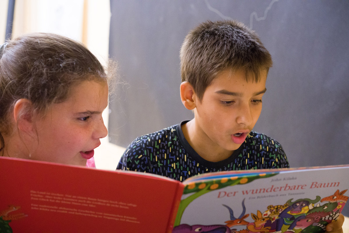 Die Garzeit der Mahlzeit vertrieben sich die SchülerInnen mit dem Betrachten der Bilder und dem tansanischen Märchen „Der wunderbare Baum“ von John Kilaka, das von allen in der Gruppe in verschiedenen Teilen vorgelesen wurde. Dieses Stück soll in der Folgezeit als Theaterstück umgesetzt werden und es gab hier schon erste Überlegungen dazu. Bebildert werden soll das Märchen in der landestypischen „Tingatinga-Malerei“. Darauf, diese Malerei auszuprobieren, bekamen die Kinder große Lust.