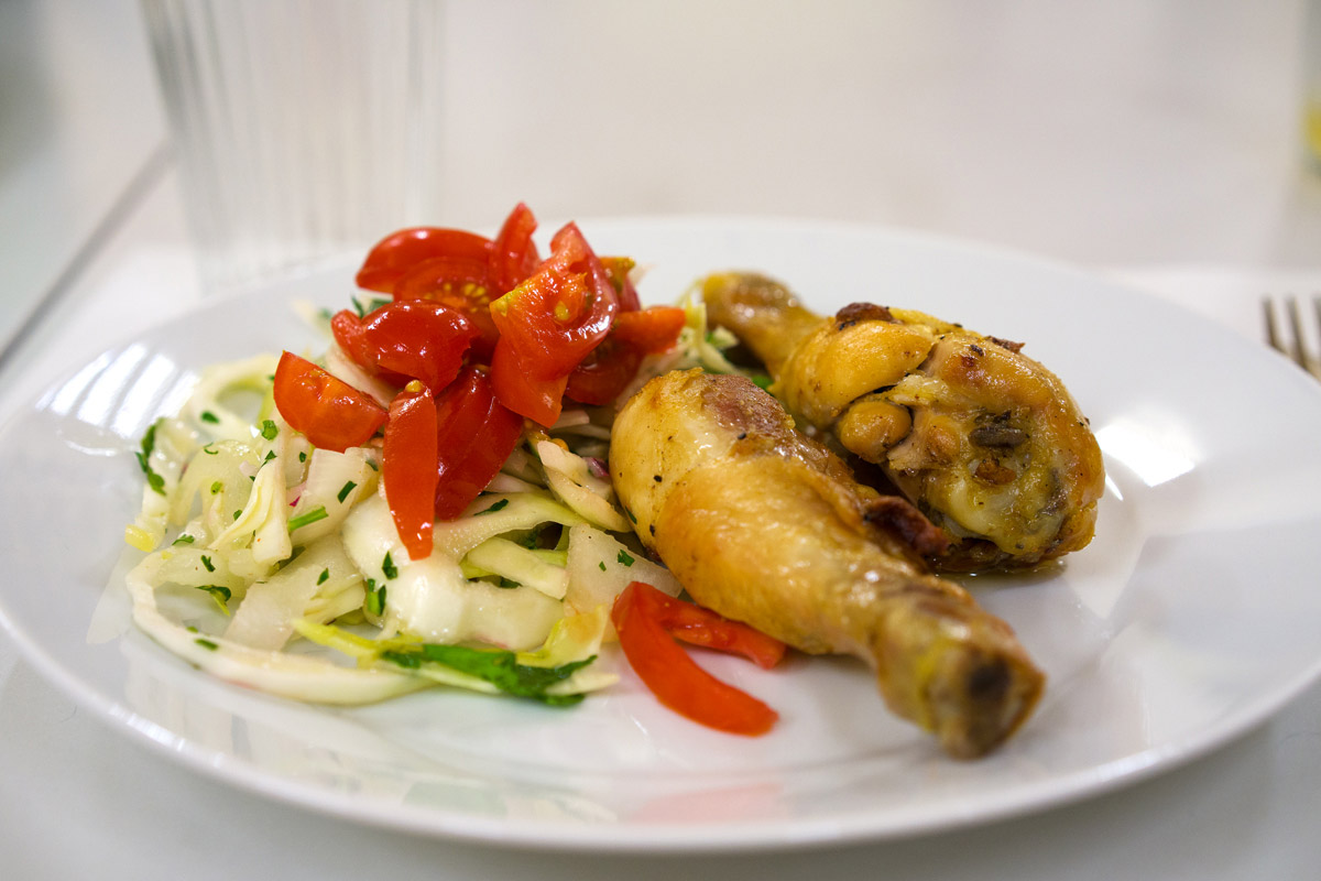 Auf der Speisekarte stand „Chicken Arusha“ – ein würzig gebratenes Hähnchen mit gebackenen Bananen. Als Beilage bereiteten die SchülerInnen „Kachumbari“ zu, einen erfrischenden Weißkohlsalat, der mit Koriander, Zitronensaft und Chilischoten gewürzt wird. Die Essensunterlage hatte Jan mit einer Weltkugel gestaltet, auf der die Lage Tansanias eingezeichnet war, und mit „Kufurahia mlo wako“, was Guten Appetit auf Swahili heißt, beschriftet.