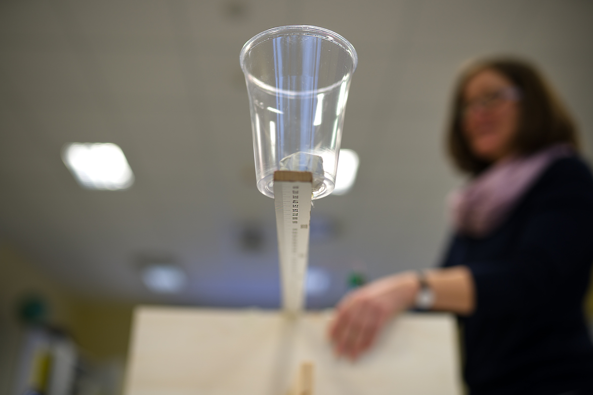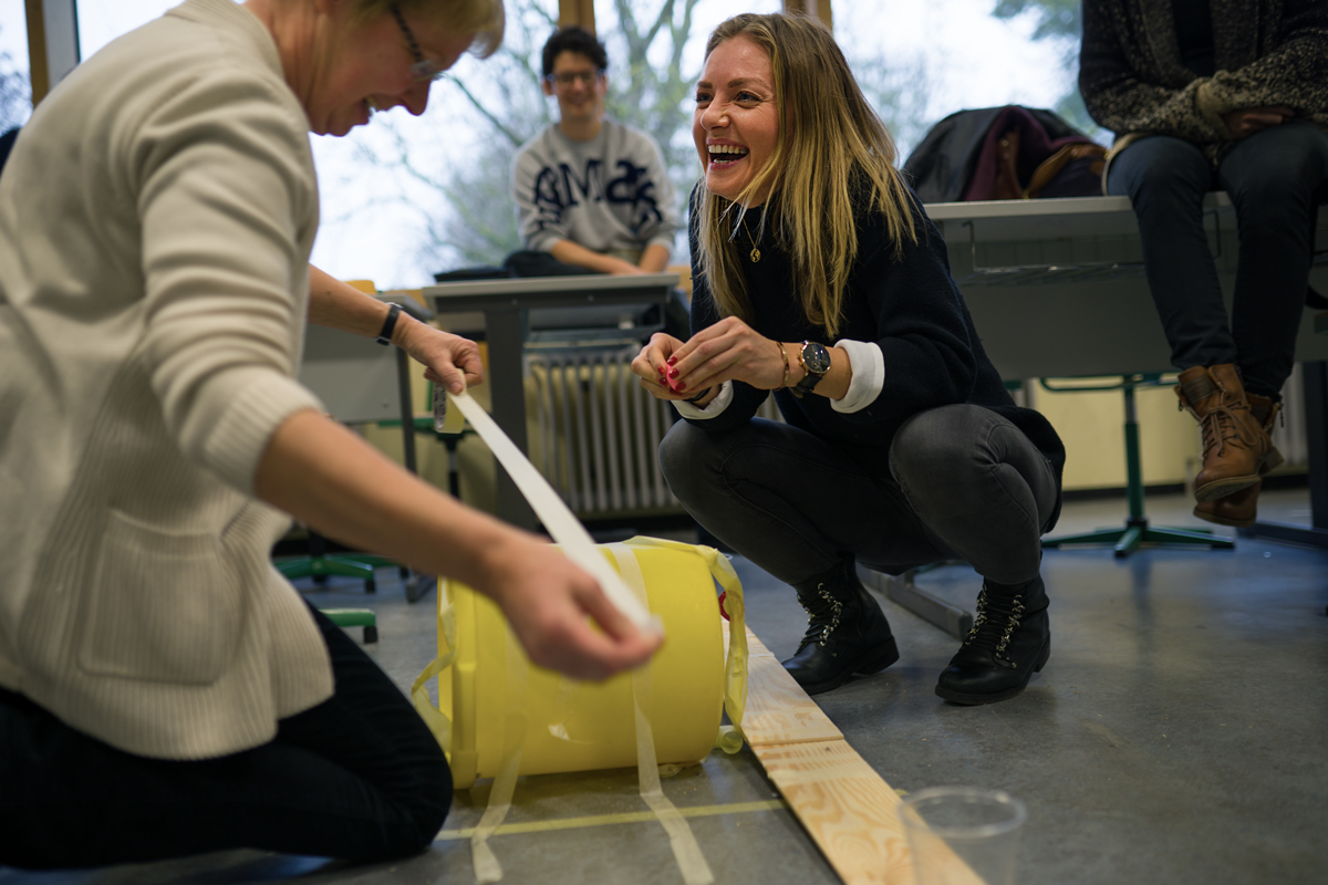 Im ersten Teil des Workshops wurde zum Thema „Das Katapult – Wie weit lässt sich ein Gegenstand schleudern?“ der Arbeitsraum mit Materialien und Werkzeugen vorbereitet, sodass wir sofort mit unserer ersten Herausforderung beginnen konnten. Die einzigen Vorgaben: Es sollte eine Wurfmaschine gebaut werden, die ein beliebiges Wurfobjekt von einer festgelegten Abschusslinie bis zu einer markierten Fläche im Raum katapultieren konnte. Gearbeitet wurde in Tandems und schnell kamen unterschiedliche Stimmungen bei den Teilnehmer*innen zutage. Die einen zeigten sich konzentriert, andere waren schnell ratlos und entmutigt, weitere entwickelten nach erstem Verwerfen der Ursprungsidee unter Berücksichtigung der Hebelgesetze neue Konstruktionen. Zum Ende der Bauphase traten die Tandems mit ihren Wurfgeschossen in einem Wettbewerb gegeneinander an.
