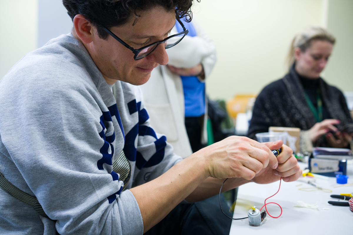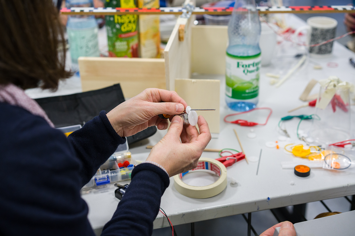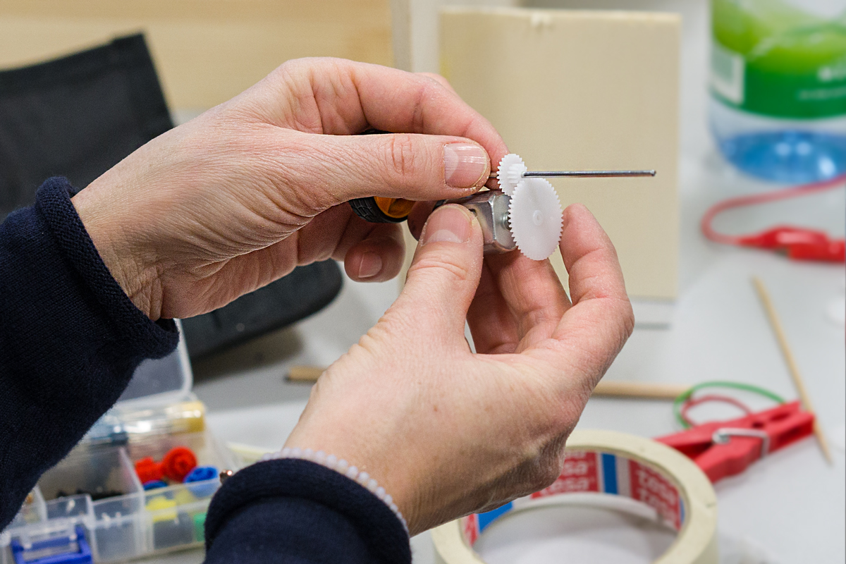Im zweiten Teil des Workshops ging es um das Thema „Der Android – Wie können sich Objekte autonom bewegen?“. Auch bei dieser Aufgabenstellung erfolgte der Einstieg direkt über die Praxis. Mit vorgegebenen Materialien wie Pappbechern, Krokodilklemmen, Wäscheklammern, Elektromotoren usw. sollte ein selbststeuerndes Objekte gebastelt werden. Zugleich befassten sich die Teilnehmenden mit physikalischen Problemen wie Stromkreis und elektrischen Schaltungen. Am Ende des Tages erfolgte ein Austausch über die neuen Erfahrungen und die Möglichkeiten, Erlerntes im Unterricht umzusetzen. Insgesamt war es ein spannender Lehrgangstag, an dem die Lehrer*innen viel über sich selbst, über physikalische Zusammenhänge, neue Unterrichtseinstiege und Ideen für den Unterricht erfahren konnten.