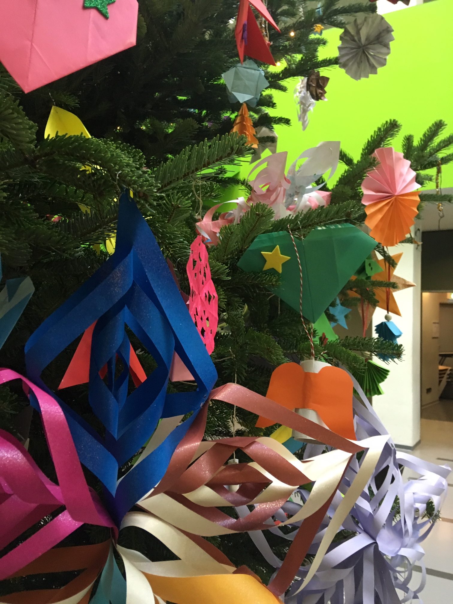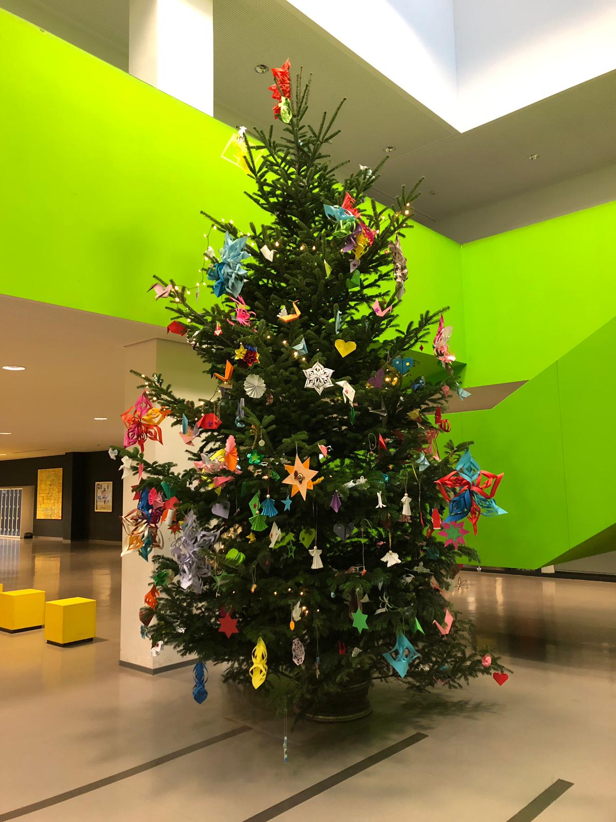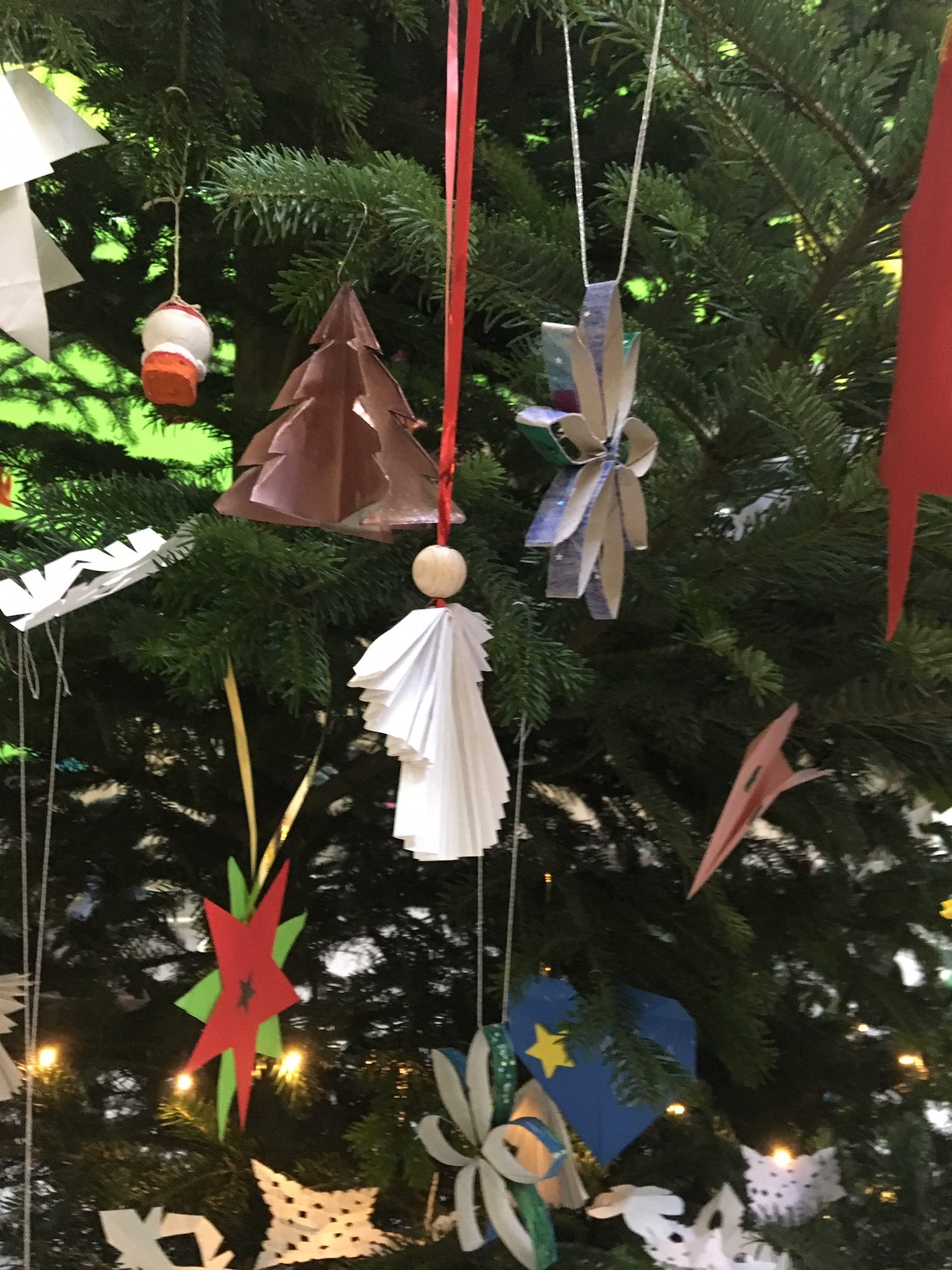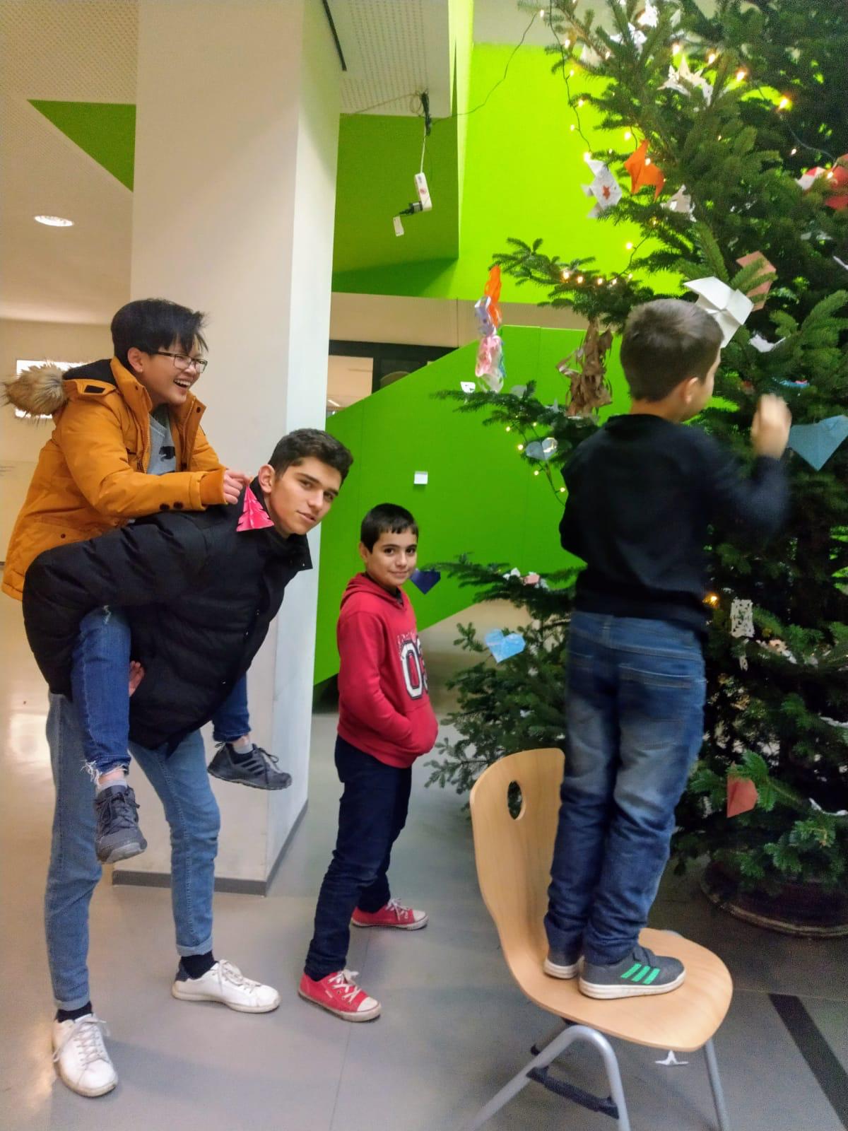 Die Schüler*innen der Intensivklasse gestalteten gemeinsam mit ihrer Lehrkraft, Frau Marinho, und unserer fliegenden Künstlerin Janina den dekorativen Weihnachtsschmuck für den in der Pausenhalle aufgestellten „Chaos-Tree“ (Weihnachtsbaum). Von den Hausmeistern im Schweiße ihres Angesichts aufgestellt und mit entsprechendem Lichterglanz vorbereitet (Vielen Dank an euch!!) schritten die Weihnachtswichtel eifrig zur Tat und sorgten dafür, dass anwesende Lehrkräfte staunend verkünden konnten: