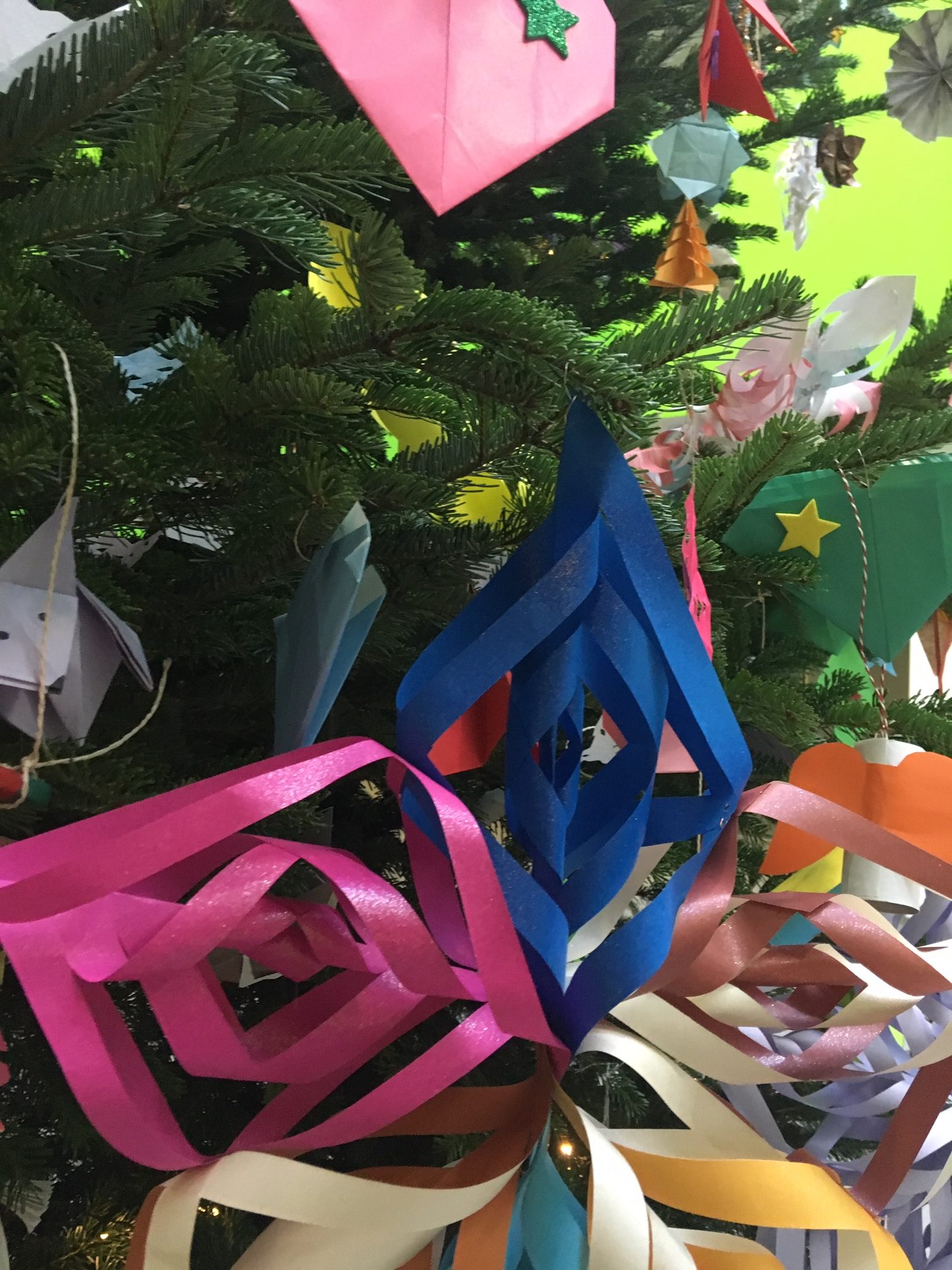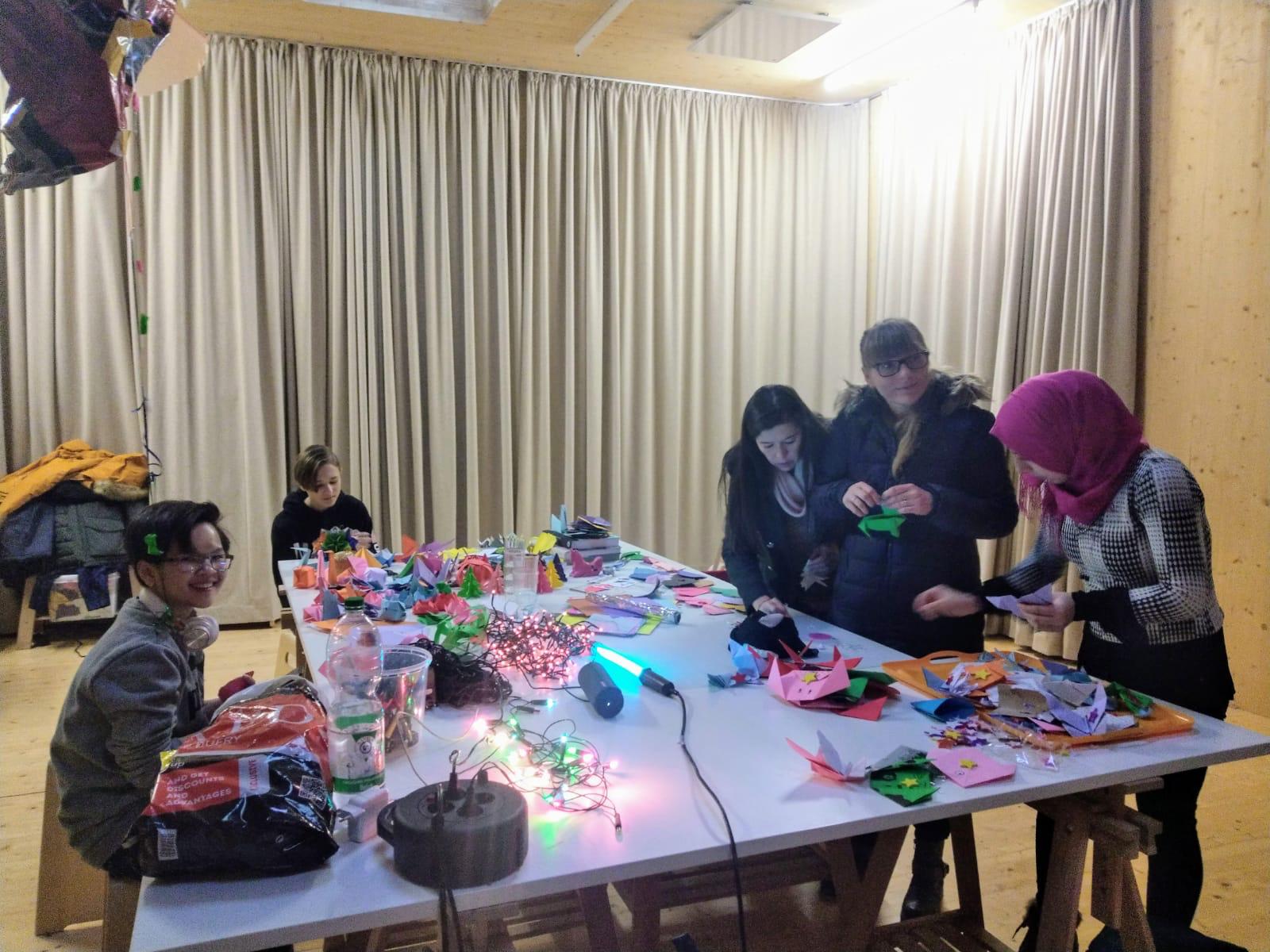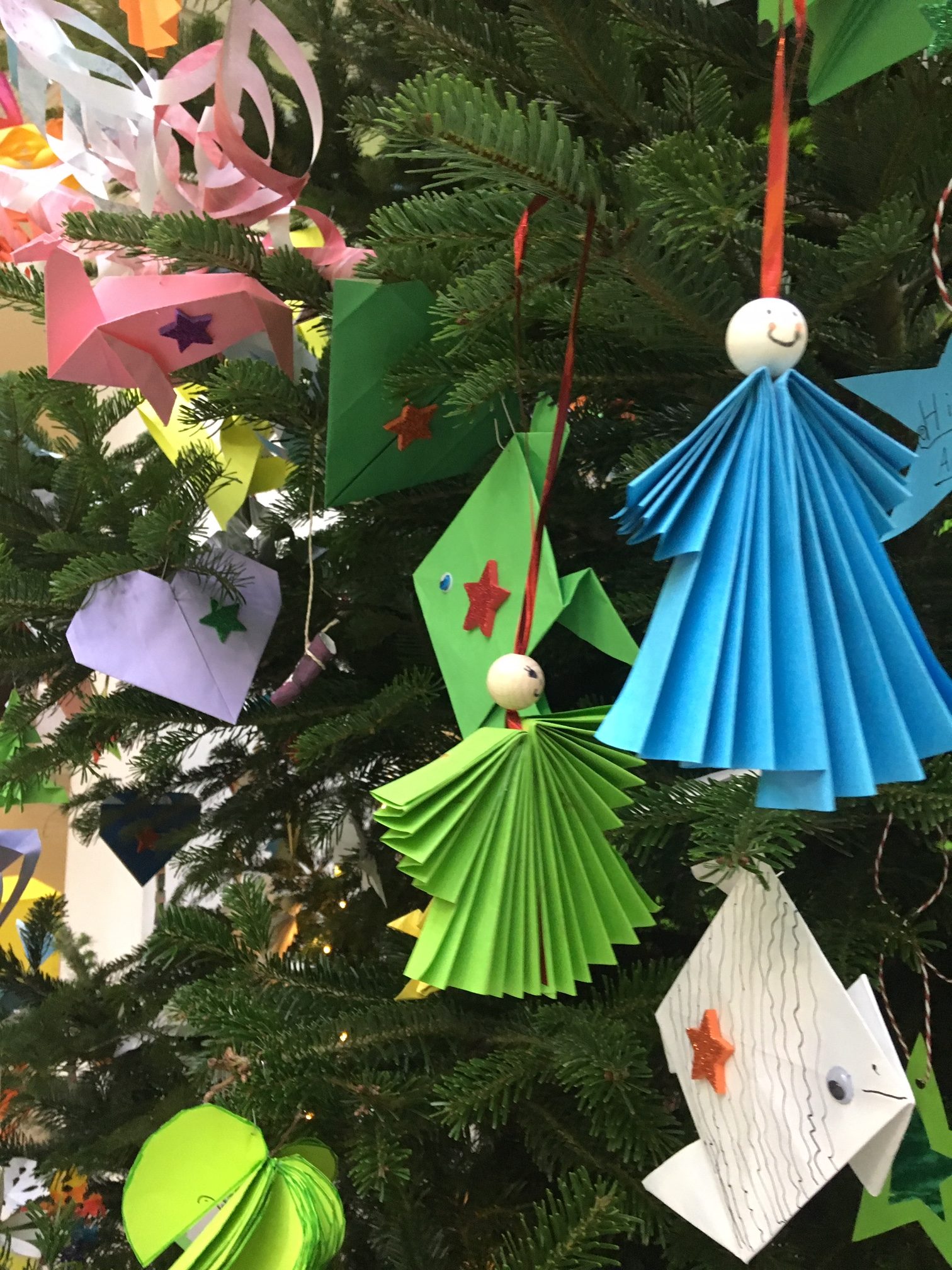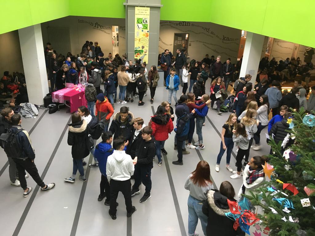Die Schüler*innen der Intensivklasse gestalteten gemeinsam mit ihrer Lehrkraft, Frau Marinho, und unserer fliegenden Künstlerin Janina den dekorativen Weihnachtsschmuck für den in der Pausenhalle aufgestellten „Chaos-Tree“ (Weihnachtsbaum). Von den Hausmeistern im Schweiße ihres Angesichts aufgestellt und mit entsprechendem Lichterglanz vorbereitet (Vielen Dank an euch!!) schritten die Weihnachtswichtel eifrig zur Tat und sorgten dafür, dass anwesende Lehrkräfte staunend verkünden konnten: