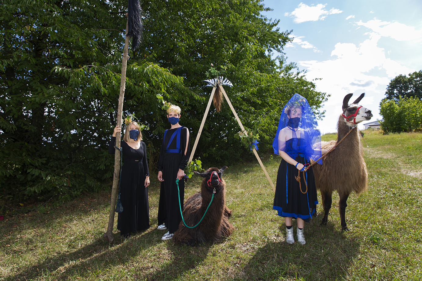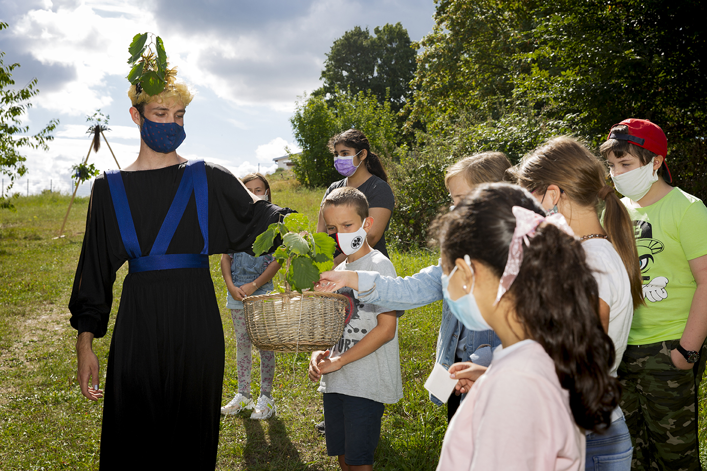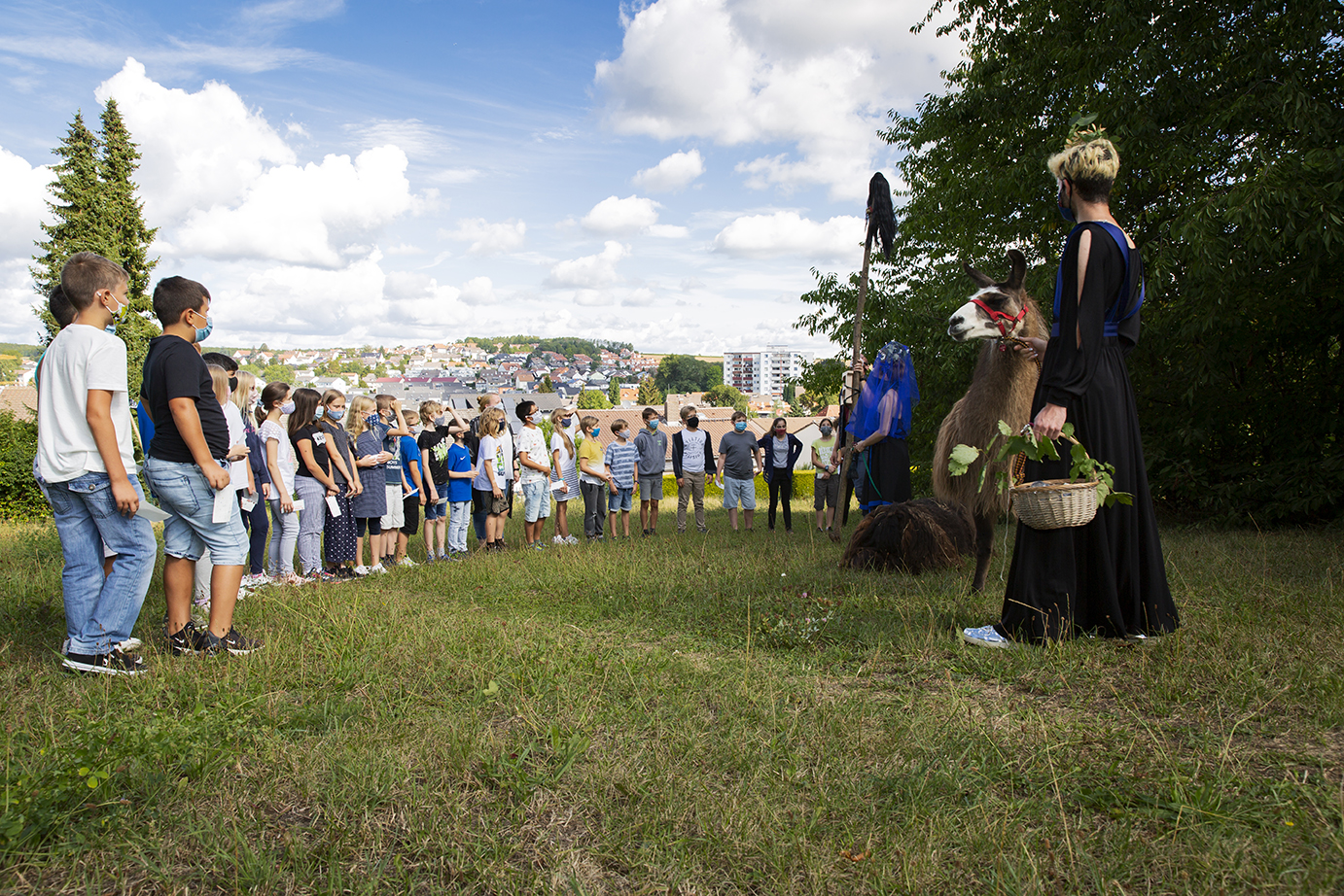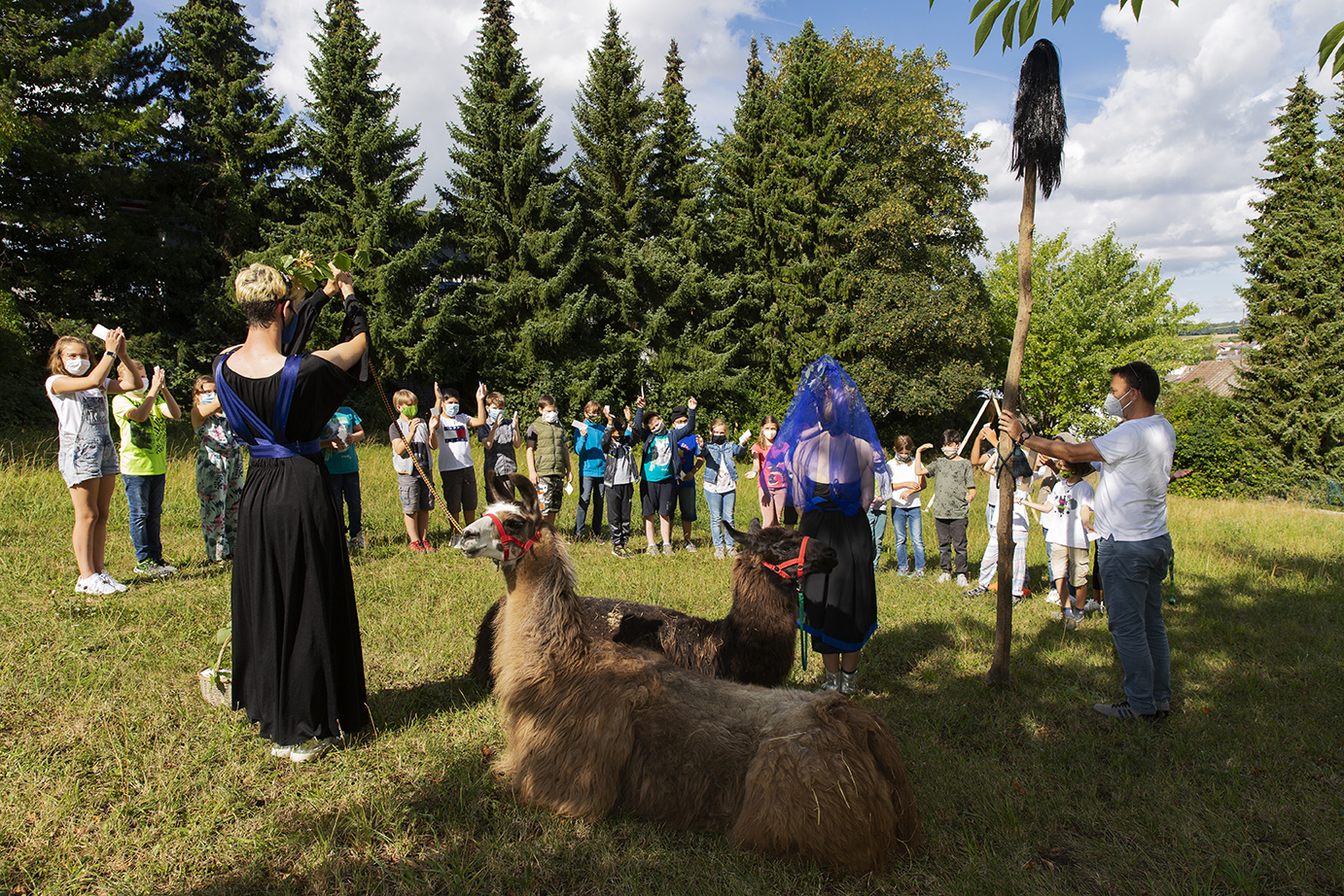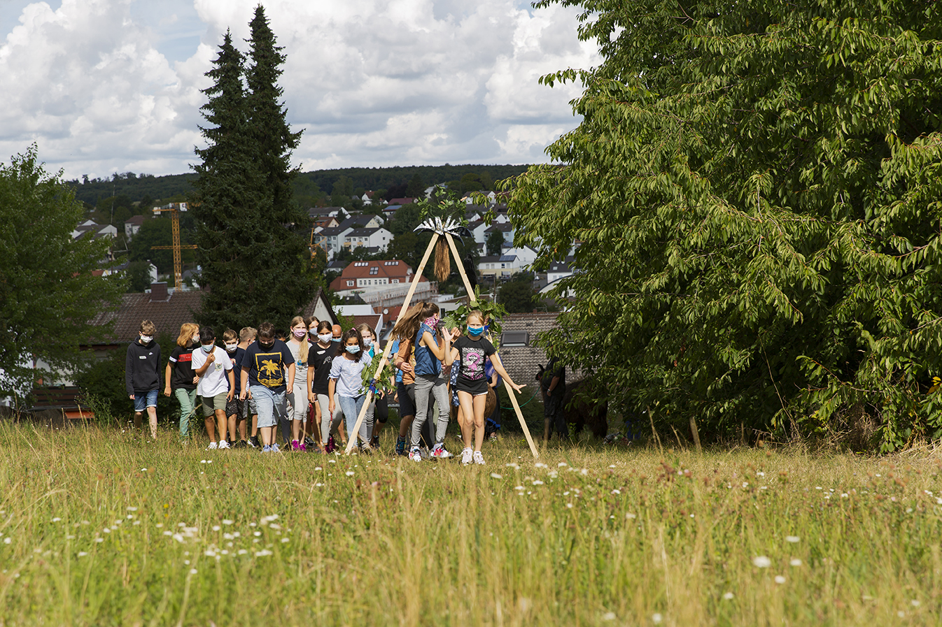 Die Klasse schreitet einen ungewohnten Weg durch einen Diskotunnel – eine weitere Installation auf der Wiese – und übergibt im Kreise des Halbmondes aktivierte Wünsche an das Traumwunsch-Orakel.