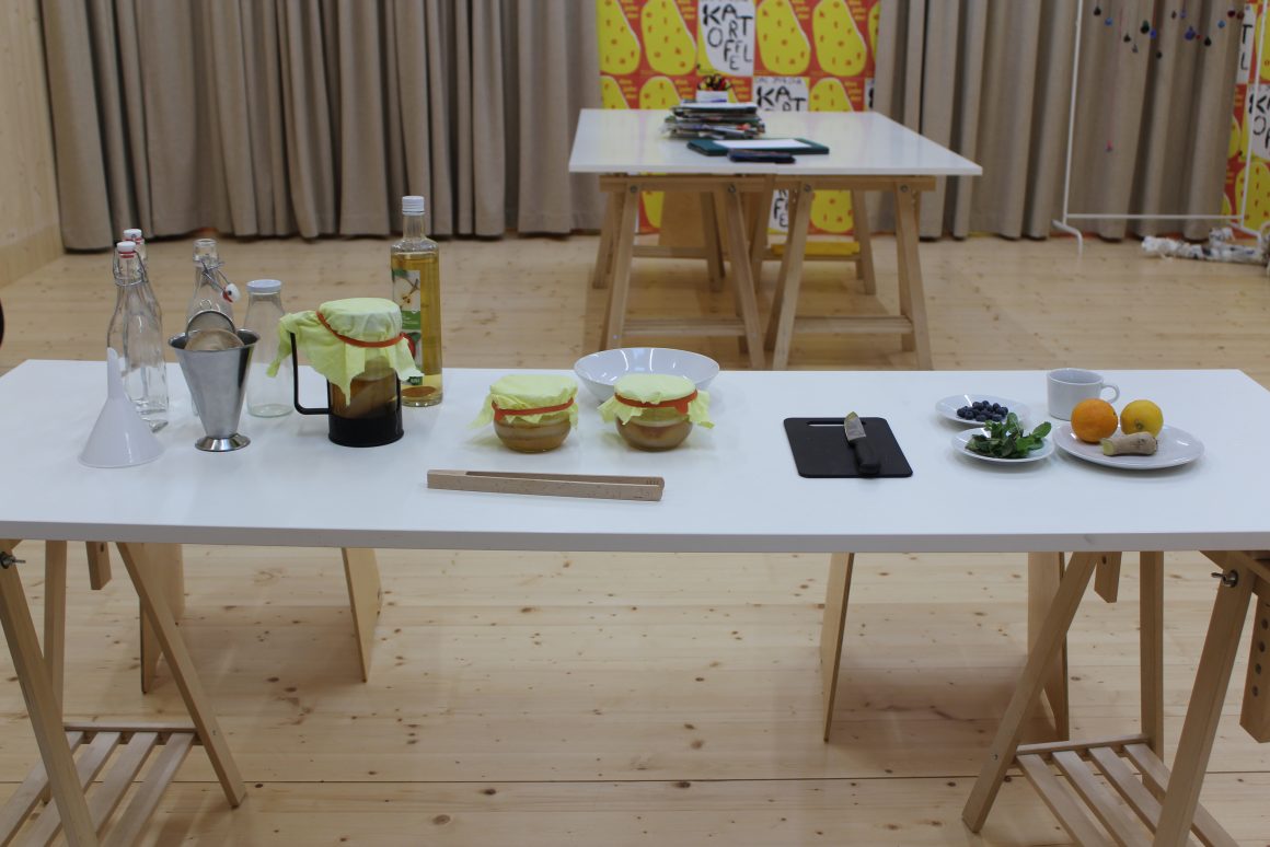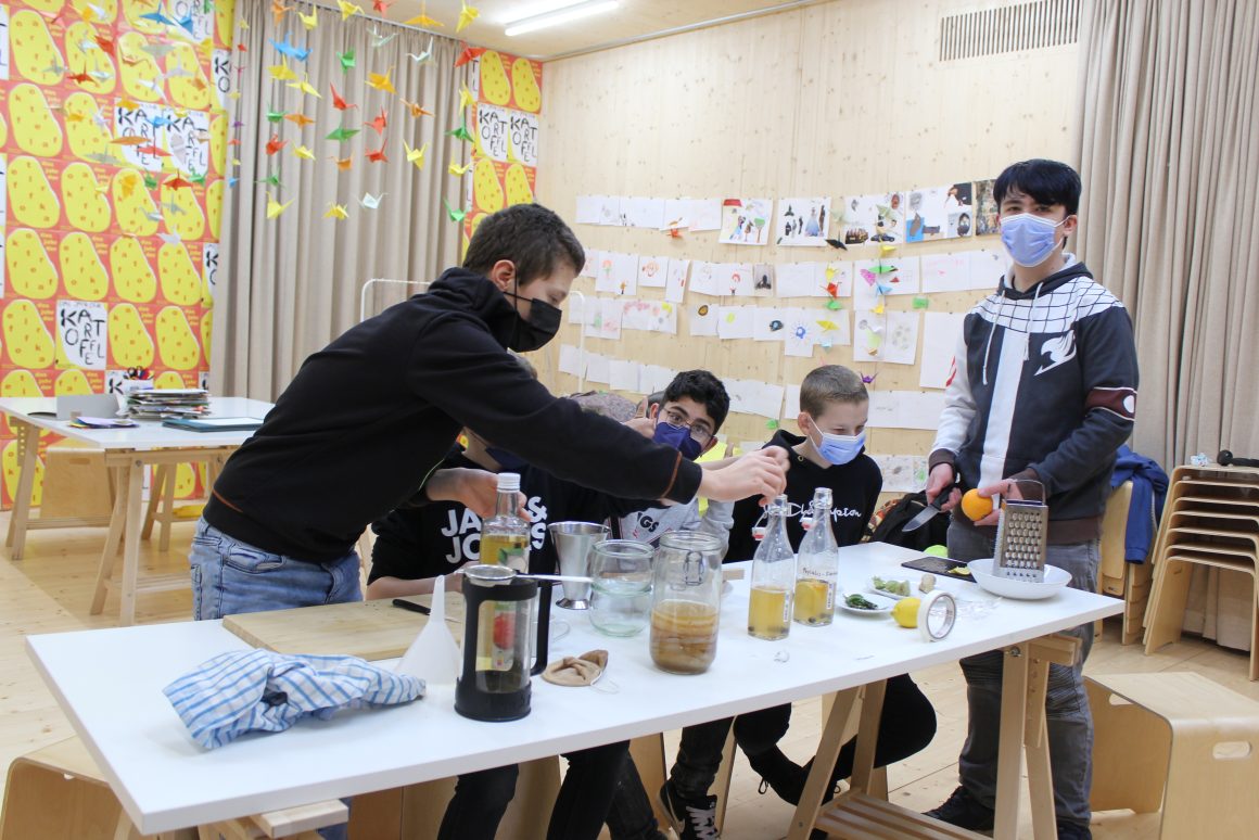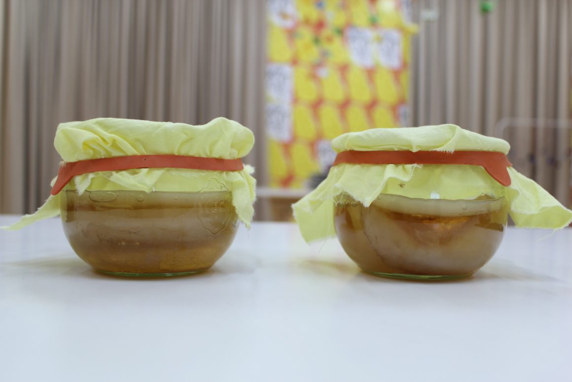 Dann stelle ich den Schüler:innen meinen SCOBY vor. SCOBY steht für „symbiotic culture of bacteria and yeast“, also symbiotische Bakterien- und Hefenkultur. Das klingt erstmal eklig und mein SCOBY, den ich kurz ins Apfelessigbad lege, um ihn ein bisschen zu putzen, wird auch eher skeptisch beäugt. Ein paar Kinder trauen sich, ihn anzufassen. Als ich dann erzähle, dass wir Kombucha machen und dass es ein fermentiertes Teegetränk ist, verliere ich so langsam das Vertrauen. Schließlich kann ich die Klasse doch noch überzeugen, dass wir es zumindest ausprobieren und ich im Notfall den Kombucha alleine trinke. „Zum Glück sind unsere Tassen so klein“, höre ich es leise murmeln.