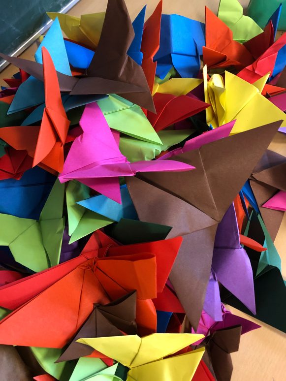 Ein Mal haben wir, um den Klassenzusammenhalt zu stärken und unsere Klasse zu verschönern, eine Art Origami-Schmetterlings-Fabrik für ein riesiges Mobile veranstaltet. Wir haben dafür etliche Schmetterlinge gefaltet.