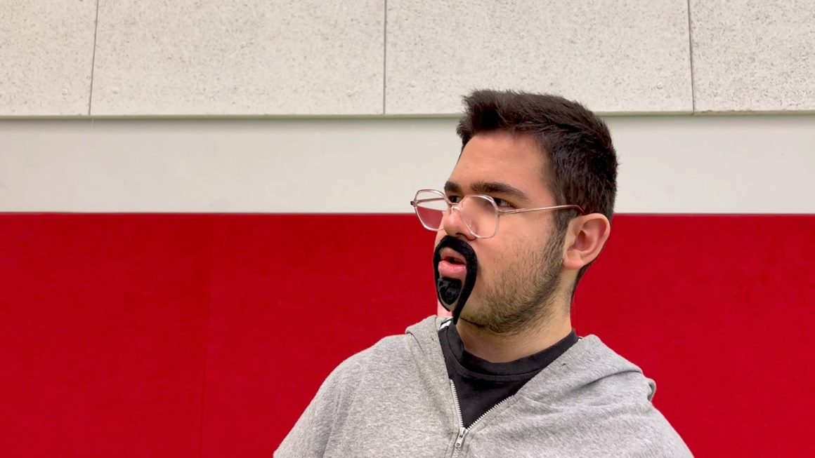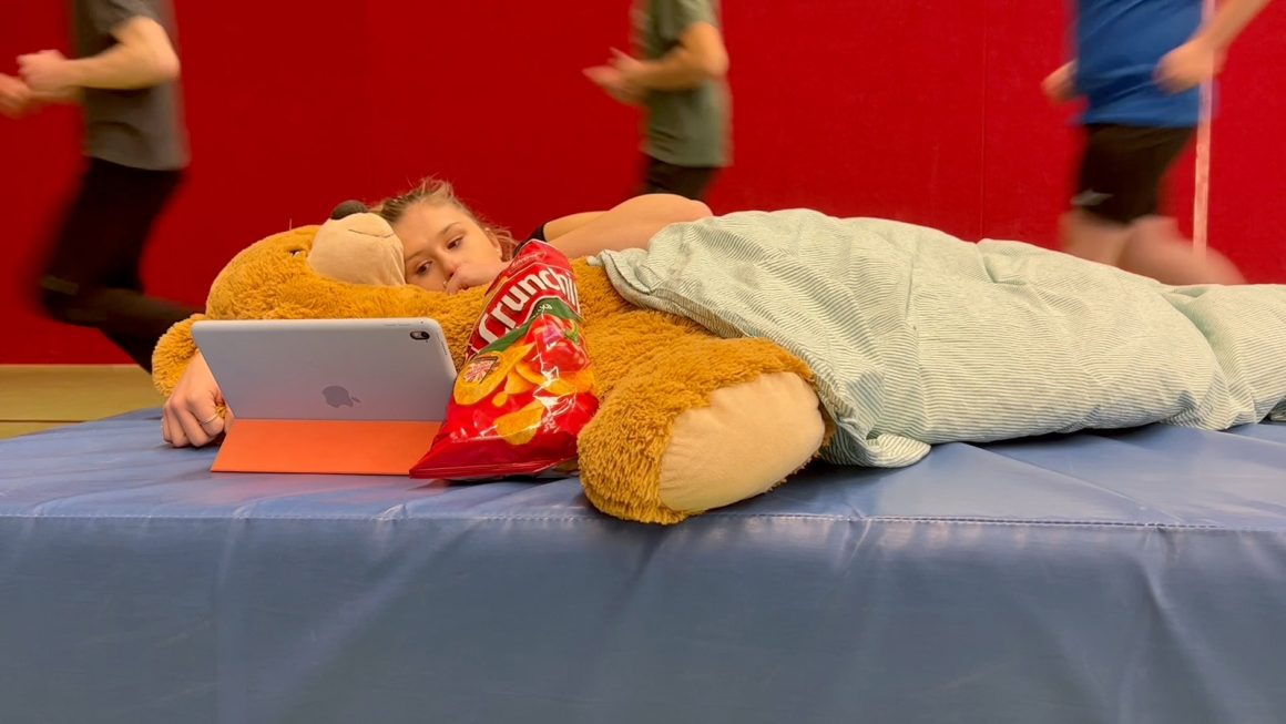 LS: Wir haben – im Gegensatz zum Unterricht sonst – immer wieder die Settings gewechselt. Eine Gruppe hat zum Beispiel einen Sketch gedreht über drei Typen von Schüler:innen und Lehrer:innen im Sportunterricht. Dafür sind wir in die Sporthalle gegangen. Wir haben auch bei Claudia im Künstlerzimmer gedreht und sie hat uns lauter Requisiten zur Verfügung gestellt. Als sie uns was über Film und Filmschnitt erzählt hat, waren wir auch bei ihr, weil es einfach eine andere Atmosphäre hat als der Klassenraum.