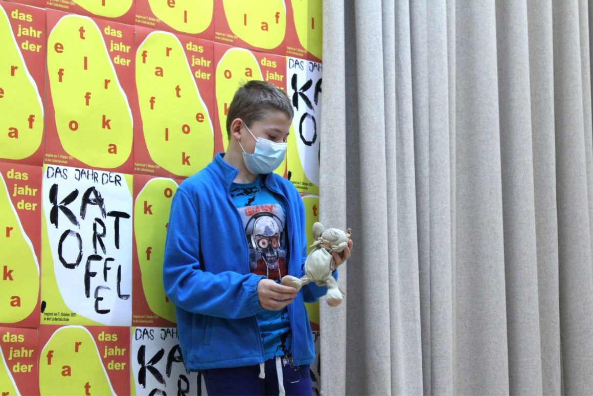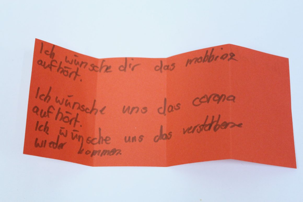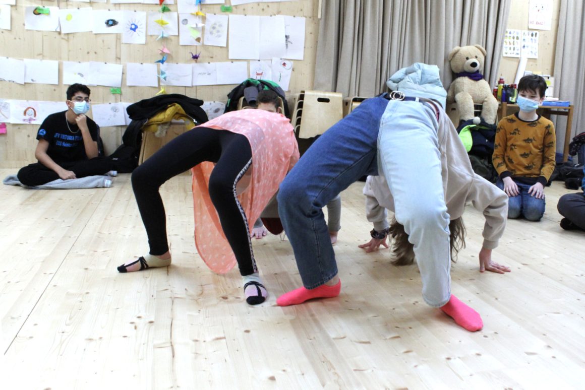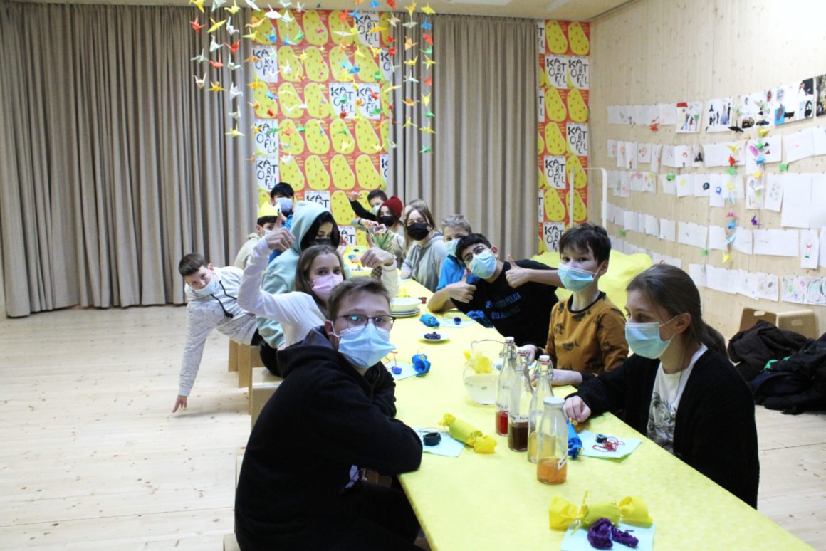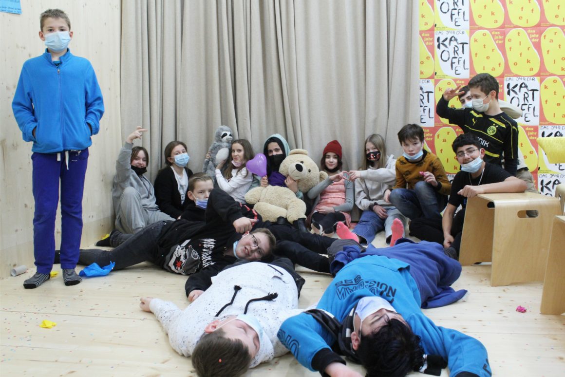 Wir treffen uns im fliegenden Künstlerzimmer und nach ein paar Spielen und Übungen schreibt jede:r für sich und die Klasse Wünsche auf. Diese werden wir uns später schenken. Dann beginnt auch schon die große Talentshow. Es werden Geheimnisse und Geschichten geteilt, Witze erzählt, Rätsel gestellt, Blaubeeren mit dem Mund aufgefangen, es wird getanzt und geturnt. Alle dürfen auf die Bühne und werden dort beklatscht und bejubelt. Nach soviel Aufregung hat man großen Appetit und die Kochlöffel werden beim Wunschkochen in der Lehrküche geschwungen.