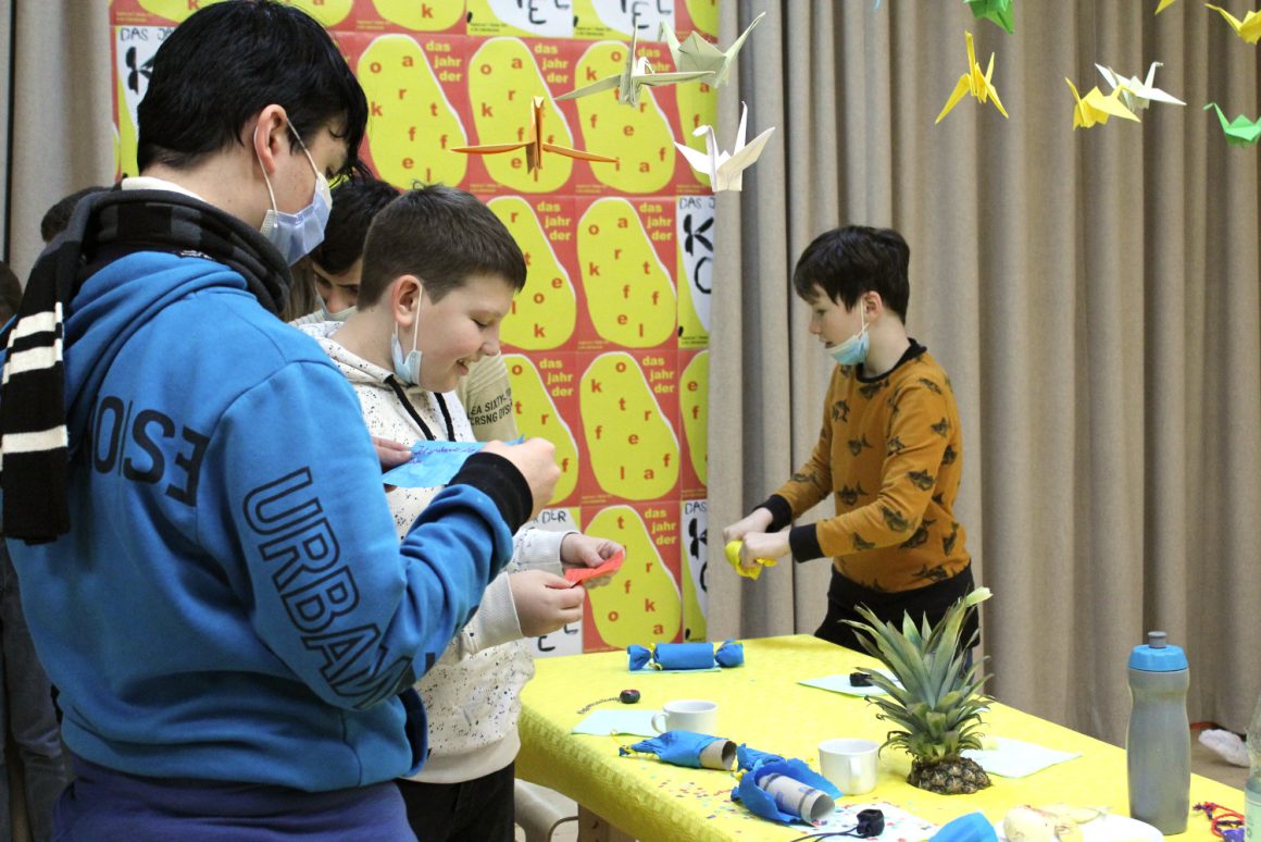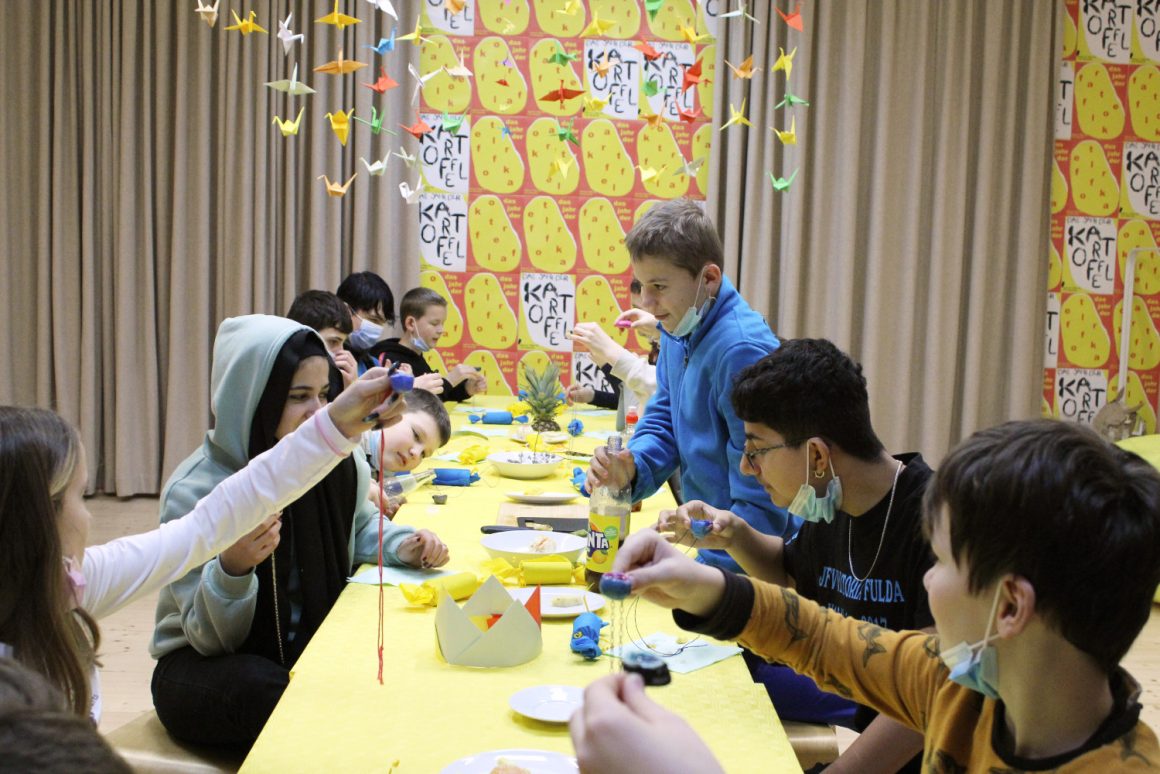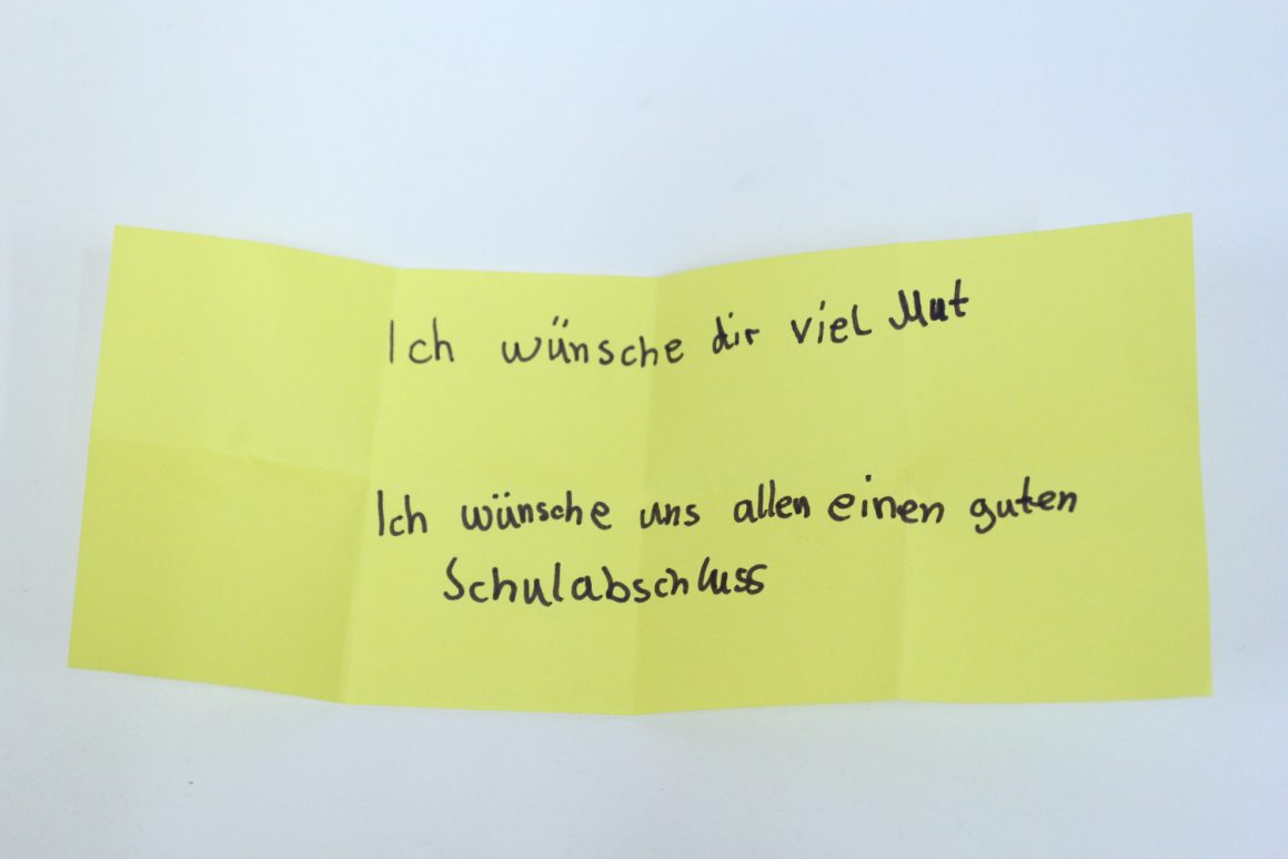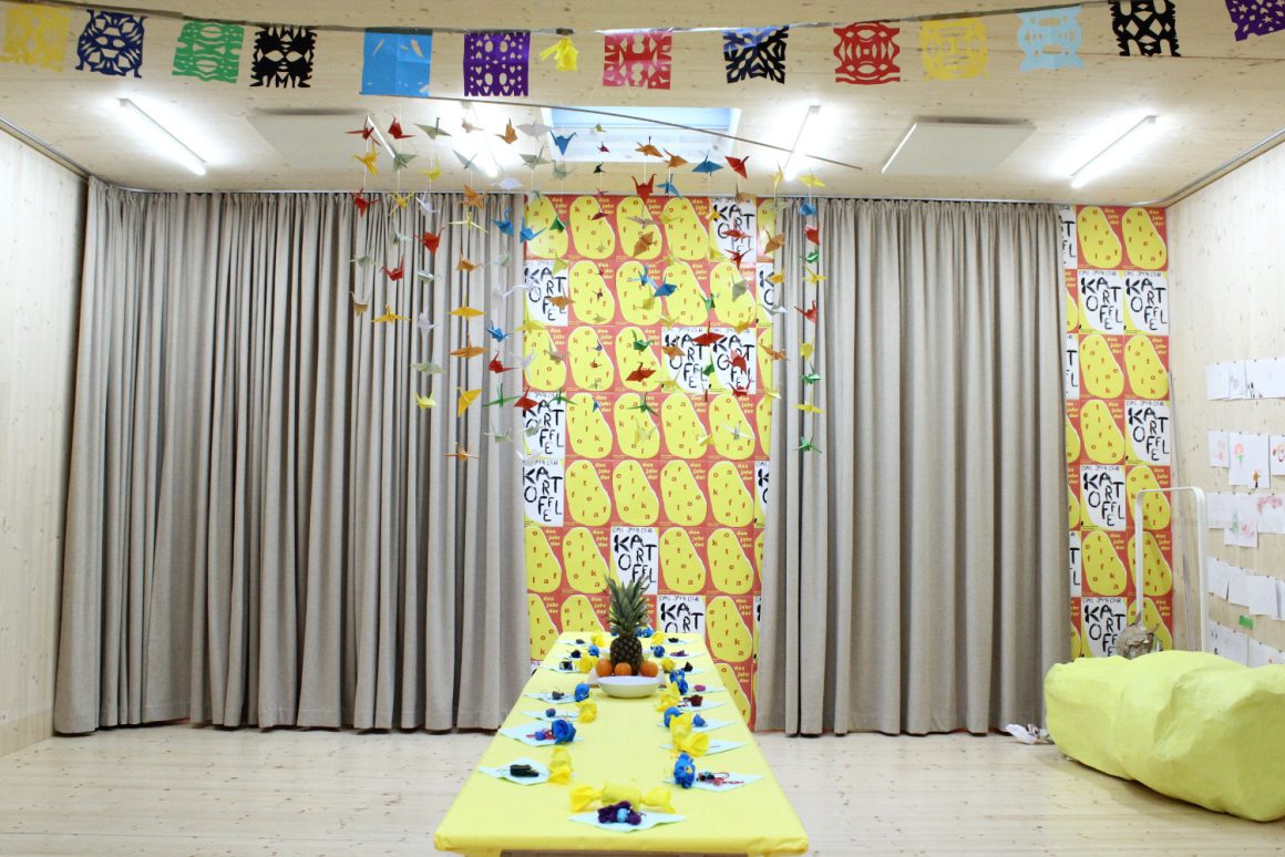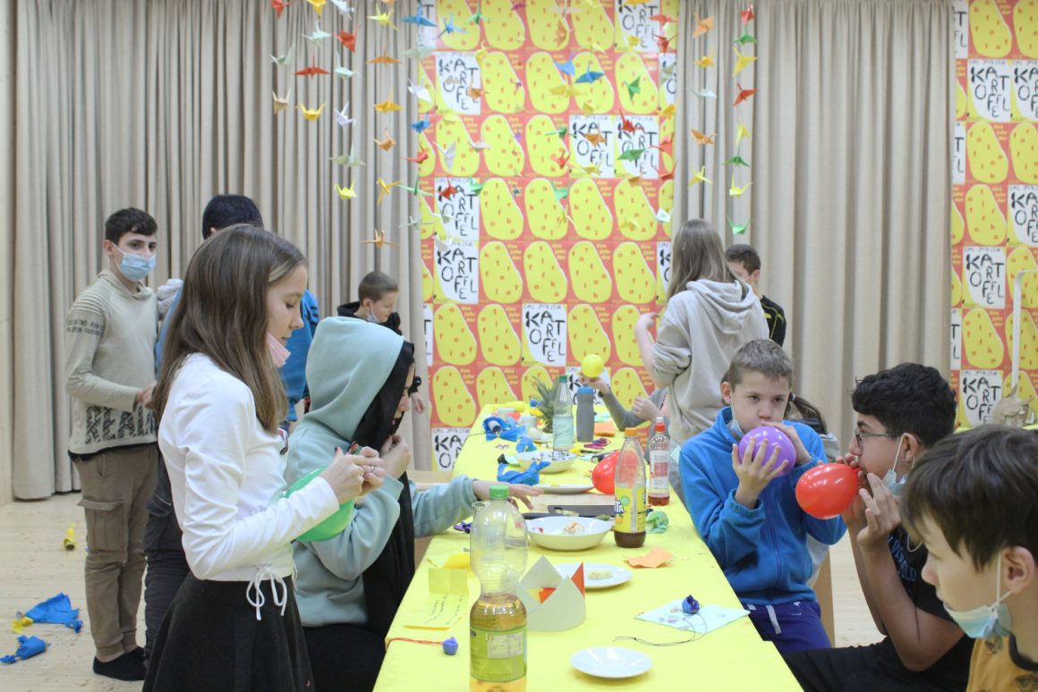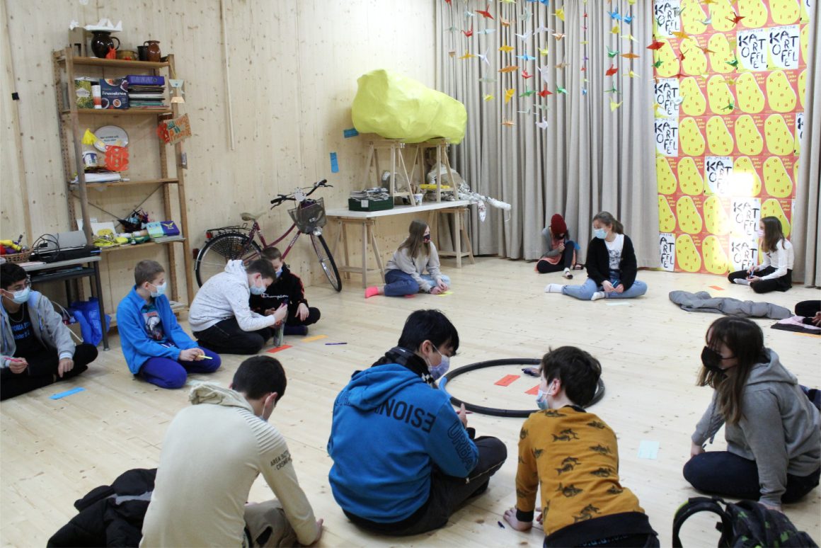 Wir treffen uns im fliegenden Künstlerzimmer und nach ein paar Spielen und Übungen schreibt jede:r für sich und die Klasse Wünsche auf. Diese werden wir uns später schenken. Dann beginnt auch schon die große Talentshow. Es werden Geheimnisse und Geschichten geteilt, Witze erzählt, Rätsel gestellt, Blaubeeren mit dem Mund aufgefangen, es wird getanzt und geturnt. Alle dürfen auf die Bühne und werden dort beklatscht und bejubelt. Nach soviel Aufregung hat man großen Appetit und die Kochlöffel werden beim Wunschkochen in der Lehrküche geschwungen.