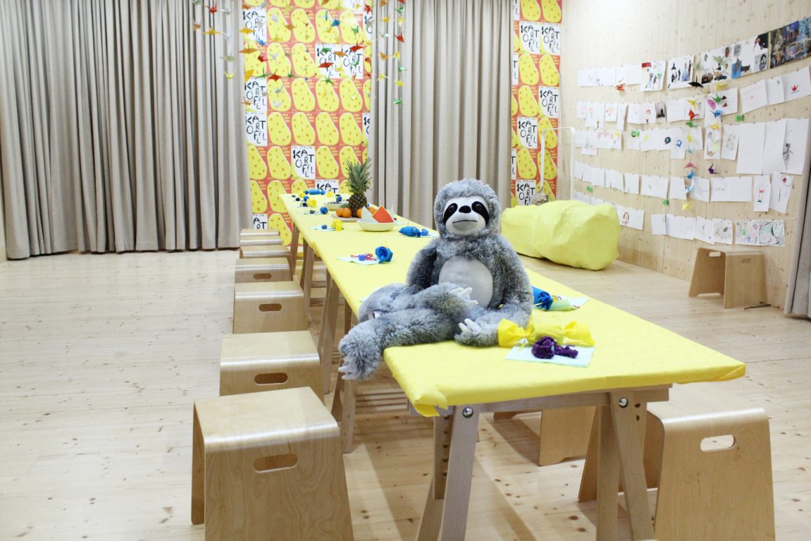 Nun geht es wieder zurück in das fliegende Künstlerzimmer, in dem sich in der Zwischenzeit eine lange Festtafel aufgebaut hat. An jedem Platz befindet sich das Tassen-Amulett und eine Überraschung-Konfettikanone.