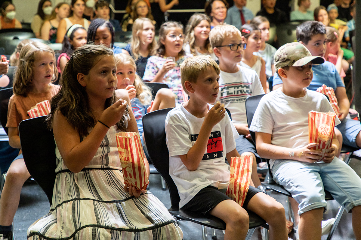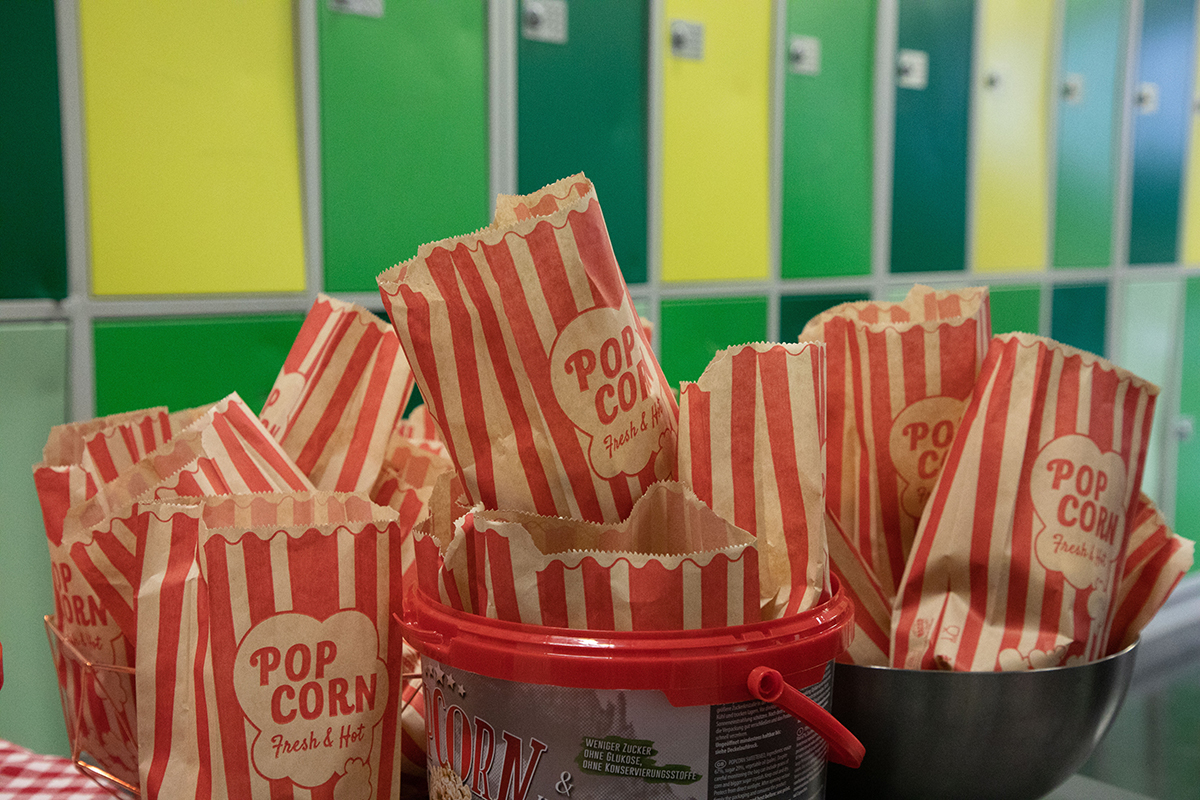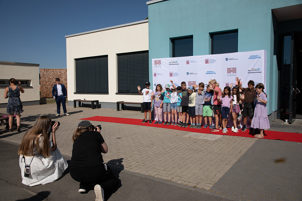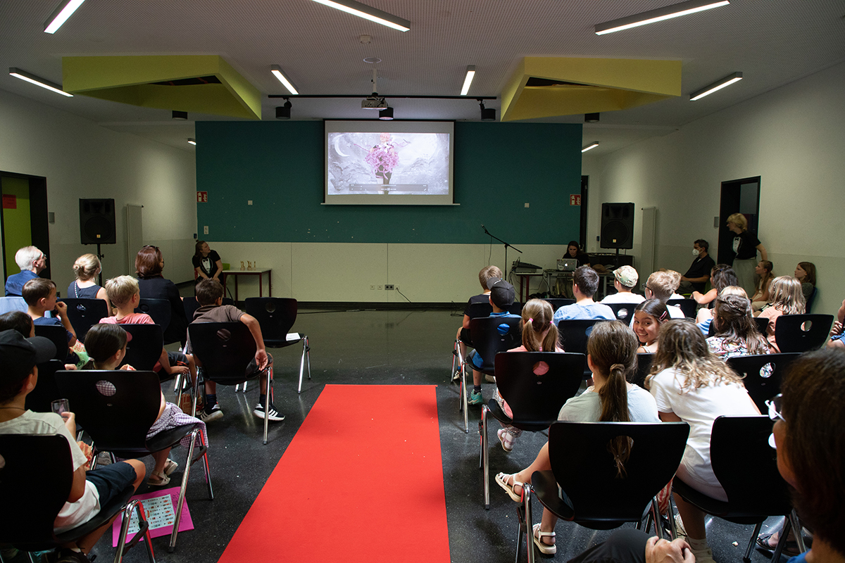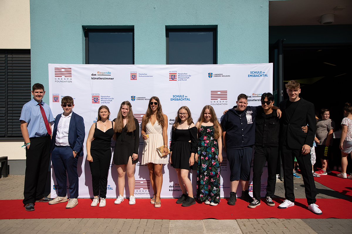 Ein langer roter Teppich schlängelte sich über den Schulhof. Große und kleine Schüler:innen der Schule im Emsbachtal durften sich wie die großen Stars fühlen, als sie ihn entlang marschierten. Fotograf:innen entlang des Teppichs untermalten dieses Gefühl. Manche Schüler:innen hatten sich richtig herausgeputzt mit tollen Kleidern und Anzügen. Es war für alle ein großer Moment, denn manche sahen ihre filmischen Produkte das erste Mal zur großen Filmgala. Diese fand zu Ehren der fliegenden Künstlerin Claudia Sárkány statt.