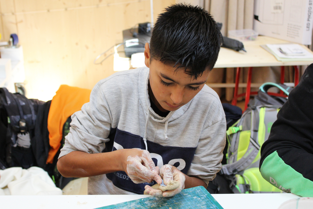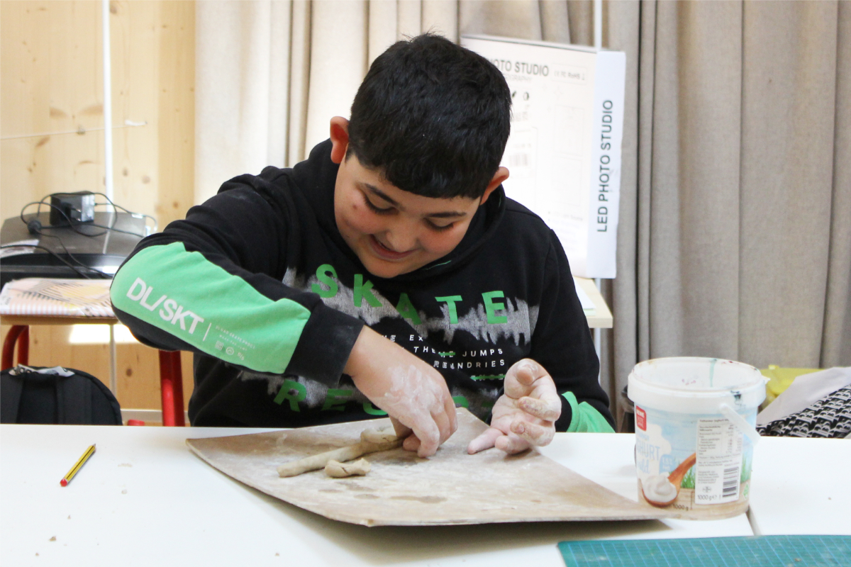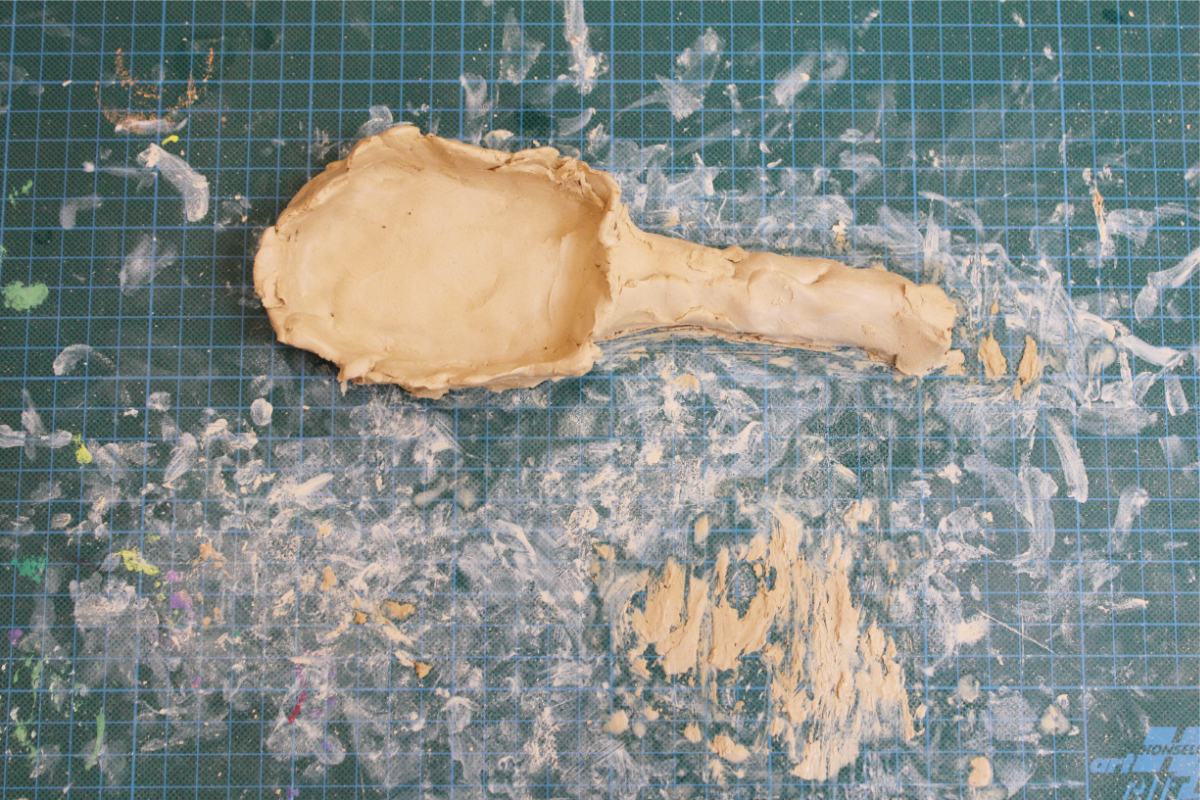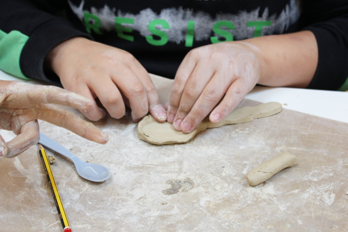 Wir sind es satt, immer irgendwelche Löffel zu verwenden! Wir wollen unsere eigenen Löffel haben. Eva zeigt uns, wie man aus einem Stück Ton einen Löffel formt. Die Laffe muss gut gerundet werden, damit man auch gut löffeln kann. Wir machen in alle Löffel auch ein Loch, damit wir unseren Löffel später aufhängen können. Jetzt müssen unsere Stücke trocknen und werden dann im Brennofen gebrannt. Das nächste Mal können wir sie auch schon glasieren.