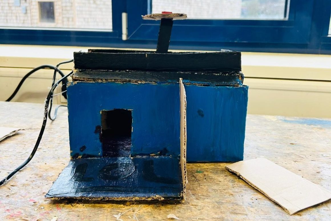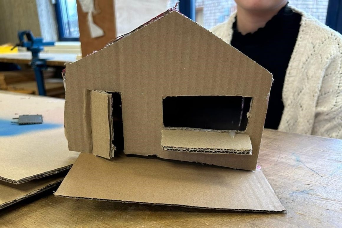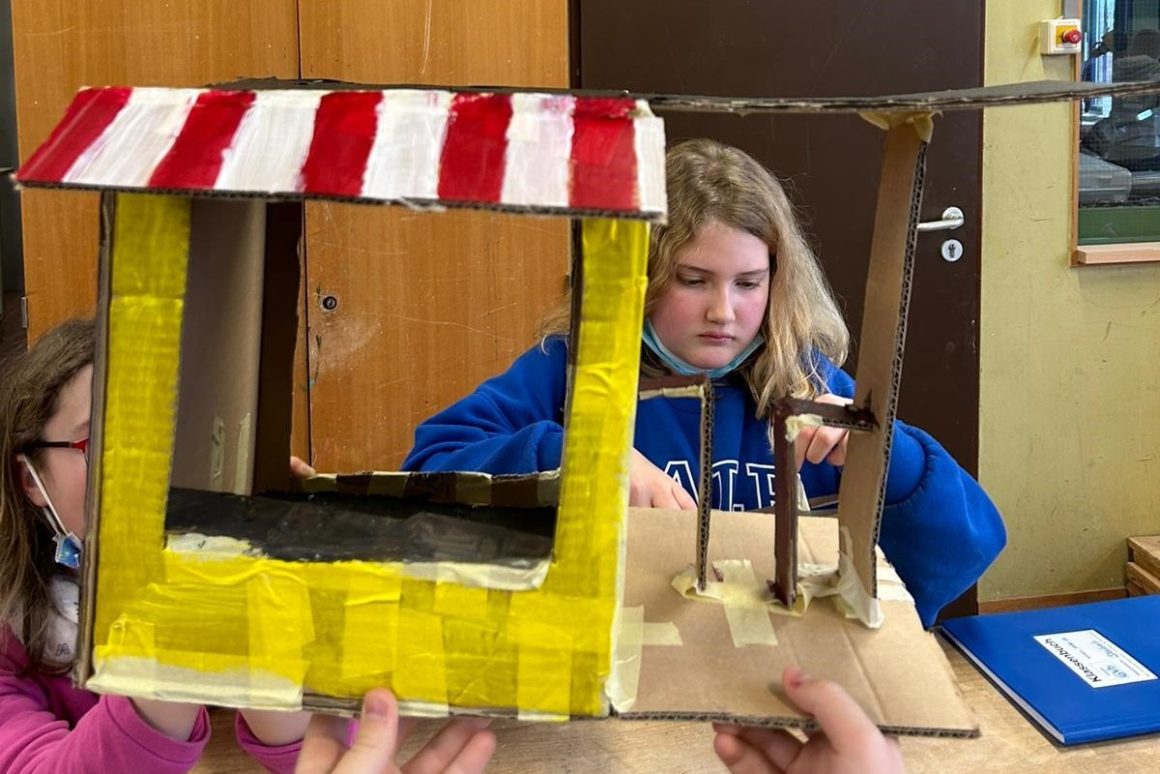 Nach einem kurzen Mittagspausen-Snack in der Mensa mit Fabian ging es los zum Kunst-Unterricht der 6. Klasse. Die Schüler:innen waren gerade damit beschäftigt, Modelle aus Pappe nach eigenem Design zu entwerfen – für einen Kiosk, welcher auf der MPS stehen soll.