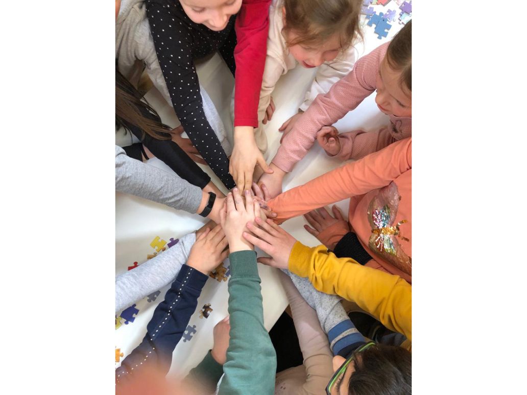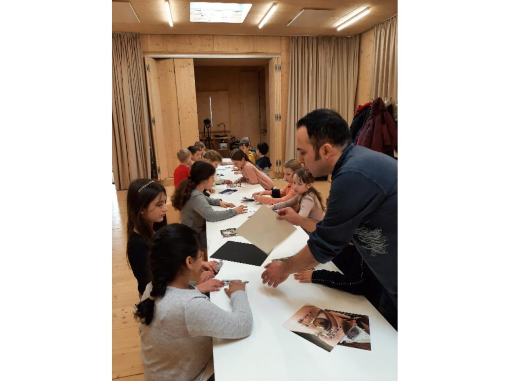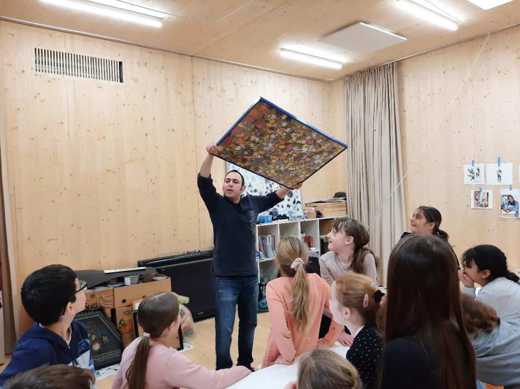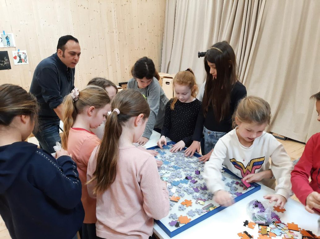 Im zweiten Teil des Workshops ging es um Puzzle. Die Kinder hatten viele Puzzleteile und sollten diese in einem Rahmen verteilen. Die Überraschung war groß, als Hassan den Rahmen hochnahm und die Kinder das Ergebnis sahen.
