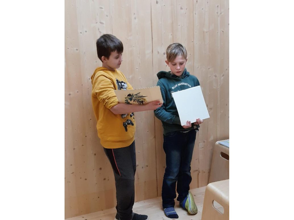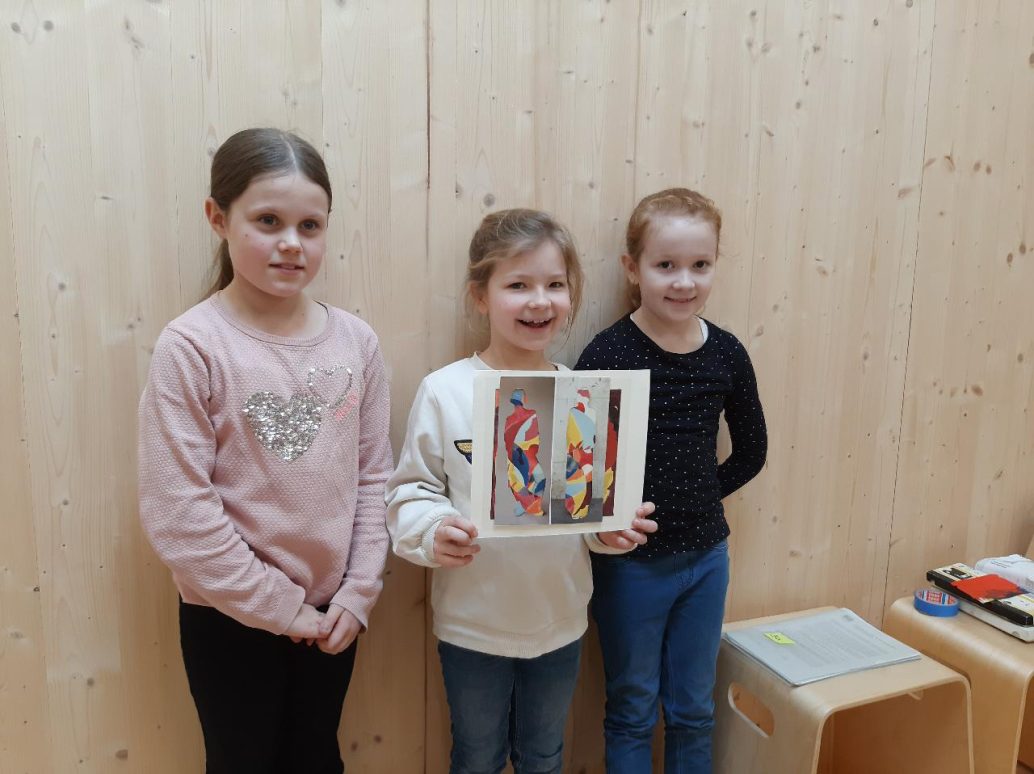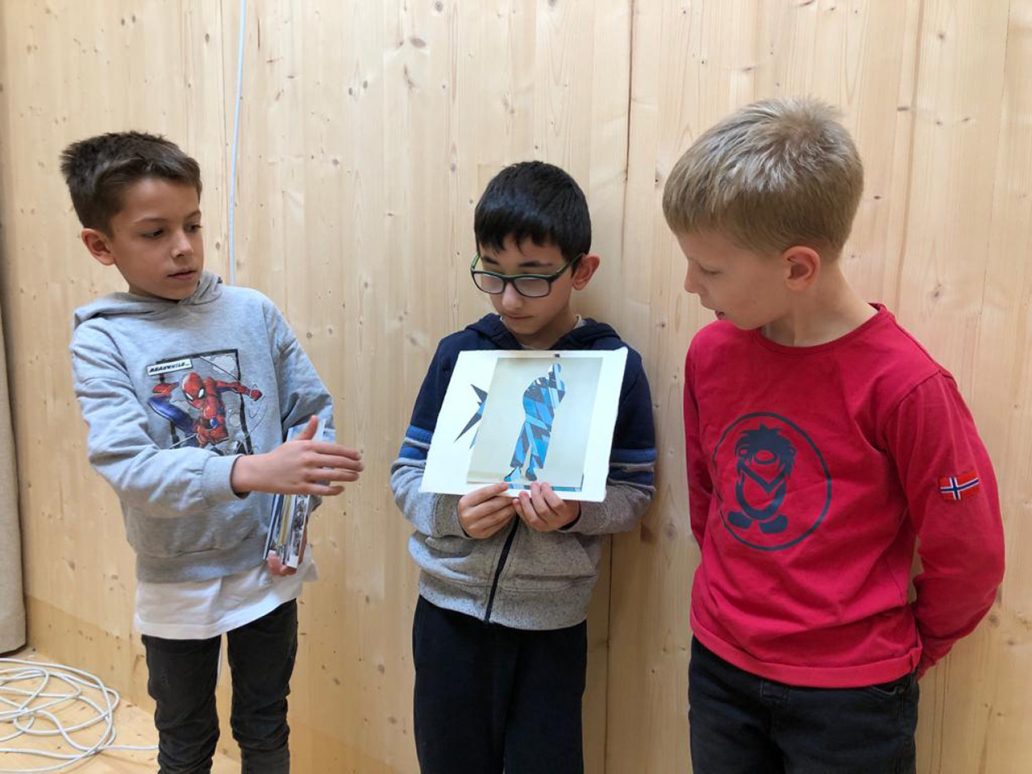 Wie in den vergangenen Workshops auch, wurden die Kinder gebeten zu erläutern, warum sie gerade dies kombiniert haben und was ihnen daran gefällt: „Die beiden Blautöne passen so gut zusammen!“, „Uns hat gefallen, dass es so schön bunt ist!“, „Wir fanden, die helle Figur passt auf den hellen Hintergrund und die dunkle auf den dunklen!“