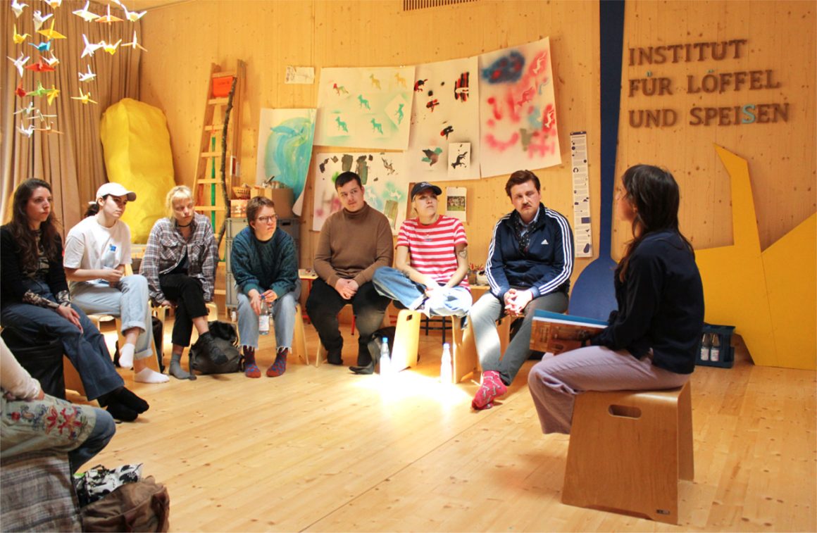Die Basisklasse der Kunsthochschule Kassel besuchte das fliegende Künstlerzimmer und das angeschlossene Institut für Löffel und Speisen. Die Studierenden fassen in einem gemeinsam geschriebenen Text zusammen:
