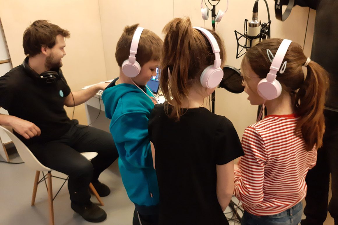 Dann wurde aus allen einzelnen Gonganfragen ein Gong für die Gruppe gezogen und überlegt, wie man diesen umsetzen kann. Nach dem Ausprobieren von Melodien und Instrumenten ging es unter professioneller Anleitung zur Aufnahme ins Ton-Studio.