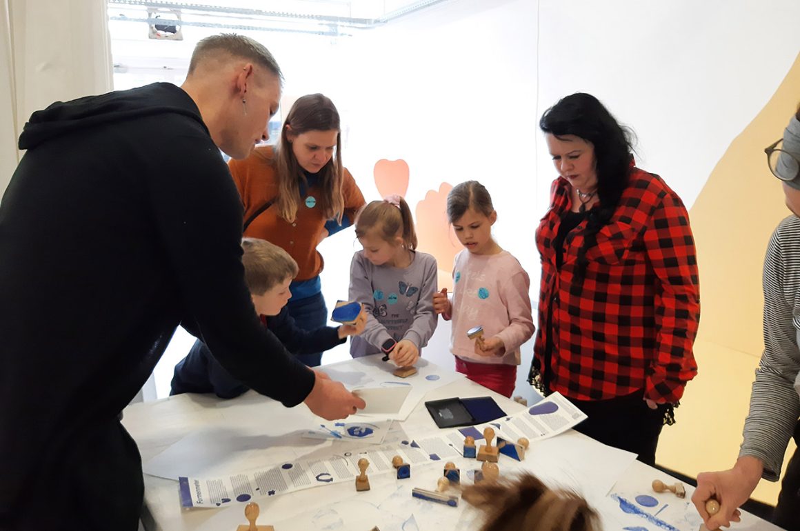 Anschließend konnte noch gestempelt werden. Die Stempelstation in der Ausstellung griff die Formen im Raum auf und animierte die Schüler:innen dazu, selbst gestalterisch tätig zu werden. Zudem sollten sie für „ihren“ Gong ein Motiv entwerfen, unter dem man diesen künftig in der Gong-Bibliothek wiederfinden kann.