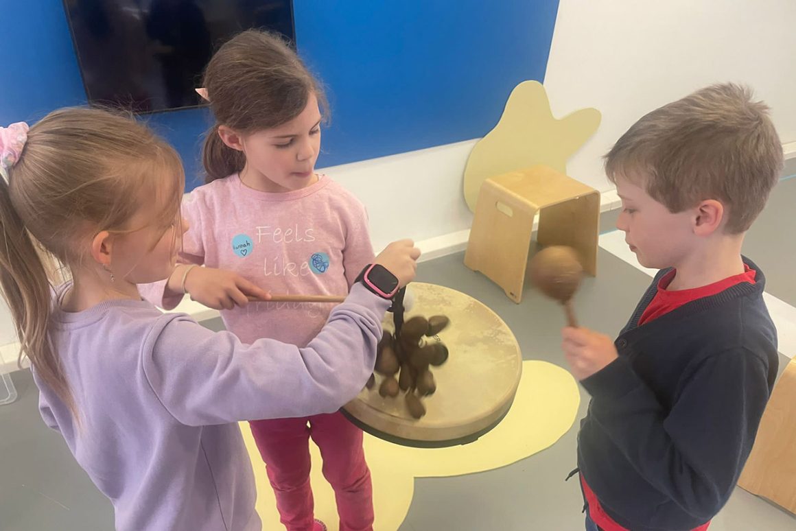 Unter der Anleitung von Christina Wildgrube konnten nun die Schüler:innen der 2. Klasse aus Niederbrechen den Raum erforschen und sich mit dem Thema „Gong“ auseinandersetzen. Nach den Warm-ups und der Einleitung ins Thema ging es darum, einzeln zu überlegen: „Wie könnte mein Gong klingen? Wann soll er erklingen? Wie soll er erklingen? Welche Wörter passen zu meinem Gong? Wie fühle ich mich, wenn ich meinen Gong höre?“