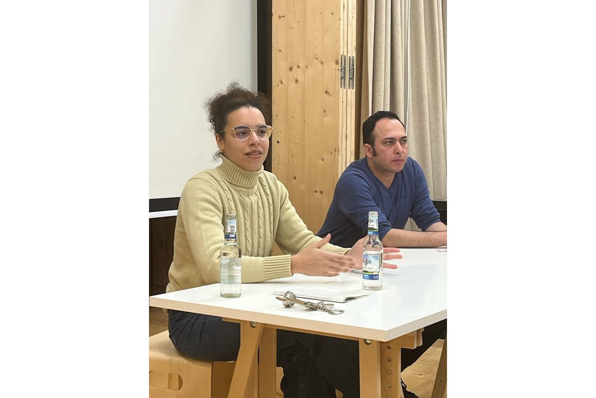 Der fliegende Künstler Hassan Sheidaei hatte die Autorin Julienne De Muirier zu sich ins Künstlerzimmer eingeladen. Die freischaffende Autorin lebt in Dortmund und war nominiert für den WORTMELDUNGEN-Förderpreis 2022 zum Thema: „Wie lassen sich Flucht, Exil und Heimatlosigkeit in Worte fassen?“