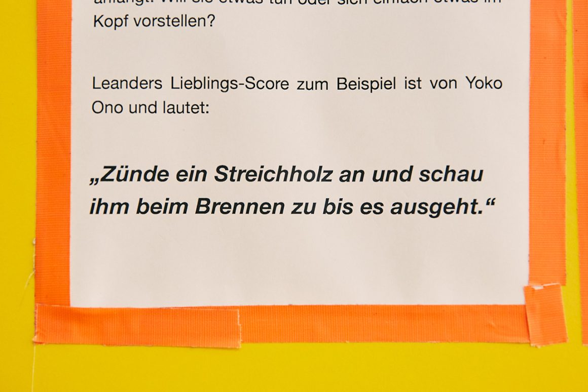 Zu den Stationen gehören unter anderem verschiedene Ausstellungen, die sich mit künstlerischen Begriffen wie dem „Readymade“ oder „Score“ auseinandersetzen. In der Aula erfolgt das „Gemeinschafts-Kopf-hören“ – eine fortlaufende Performance, bei der Schüler:innen die Texte anderer Schüler:innen vortragen, die ihnen über Kopfhörer eingespielt werden.