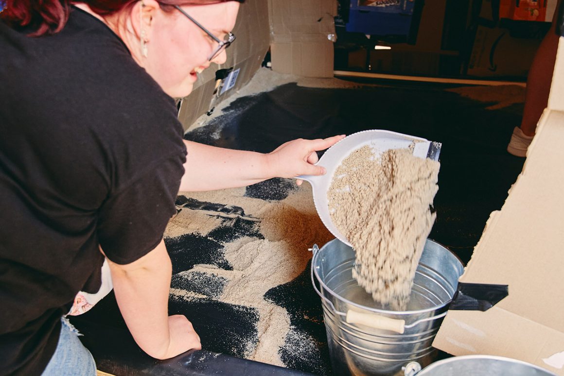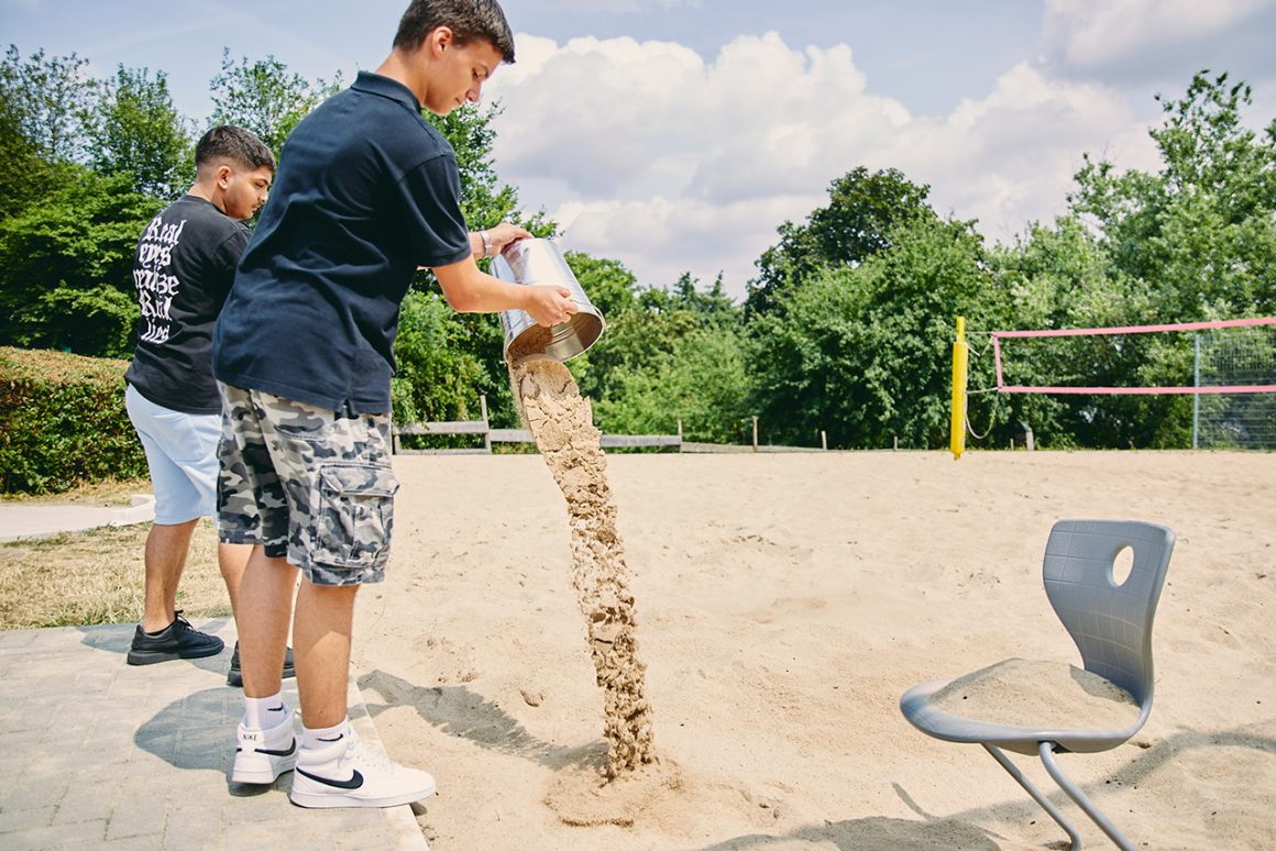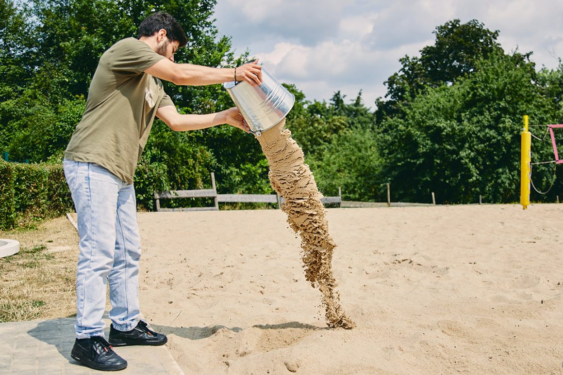 Auf dem Weg von den Volleyballplätzen zum fliegenden Künstlerzimmer bildet sich eine lange Kette an Händen, die Eimer weiterreichen, mal vor, mal zurück. Ziel ist es, das Künstlerzimmer mit Sand zu füllen. Andere Gruppen haben den Auftrag, den Sand wieder zu entfernen.