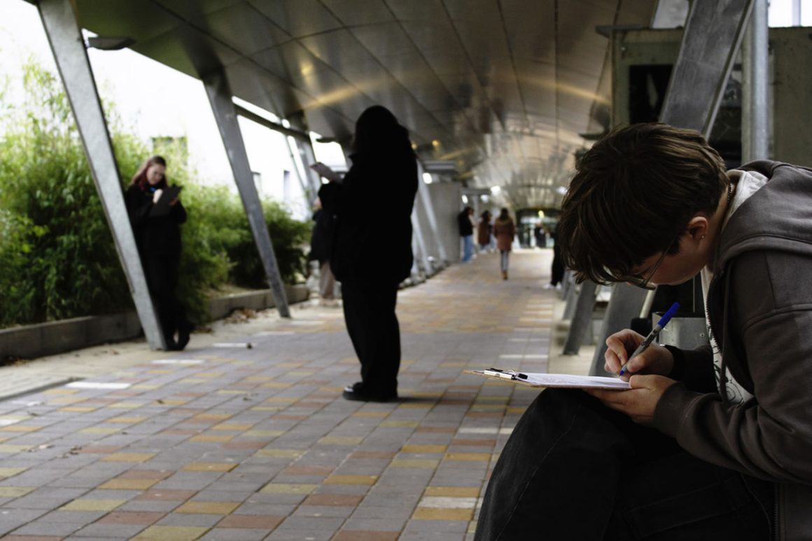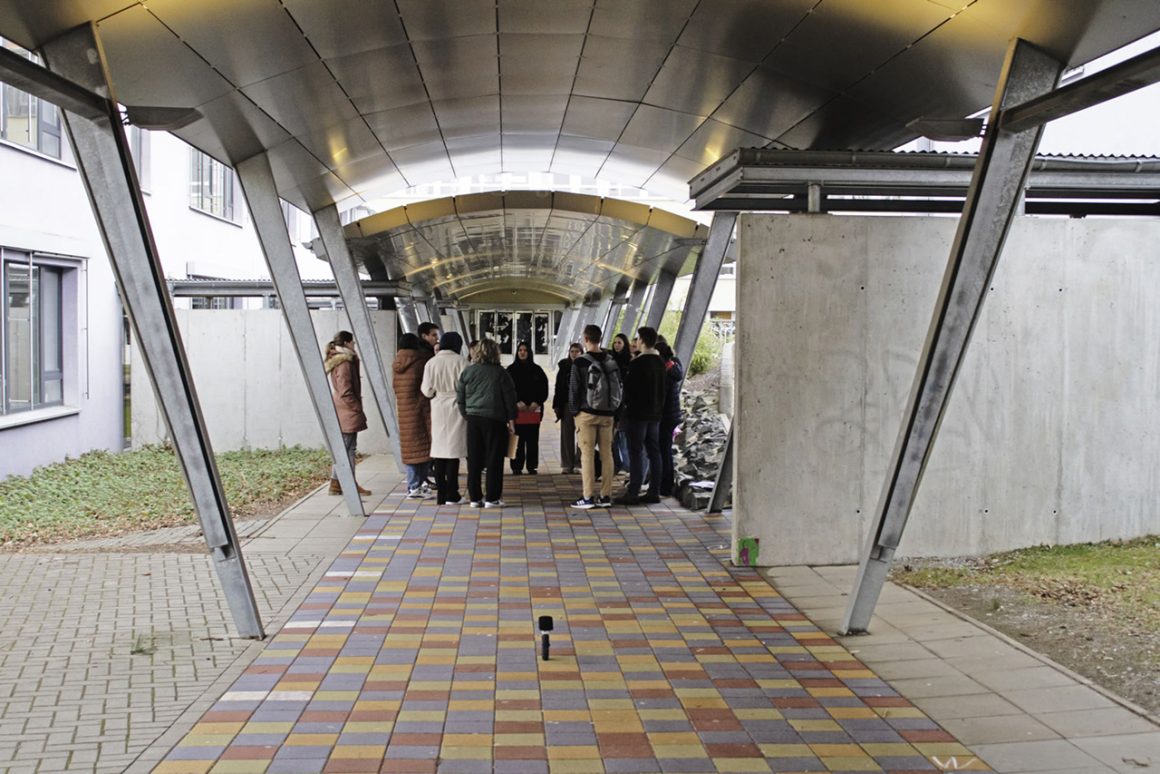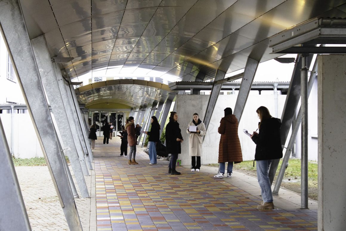 Um auch persönlich dieser Herausforderung zu begegnen, gingen danach alle in den langen Verbindungsgang zwischen 4er- und 12er-Gebäude, da dieser aus klangtechnischer Sicht das geeignetste Objekt auf dem Schulgelände ist. Die bei den dortigen Versuchen entstandenen Skizzen werden demnächst an der Litfaßsäule zu betrachten sein.