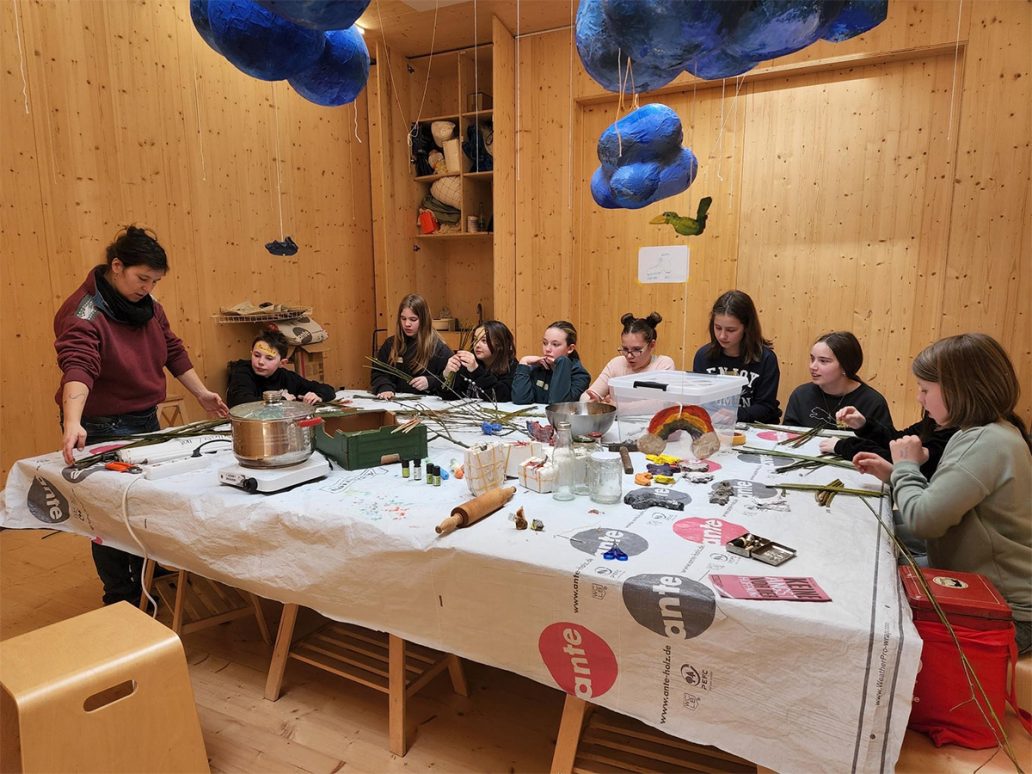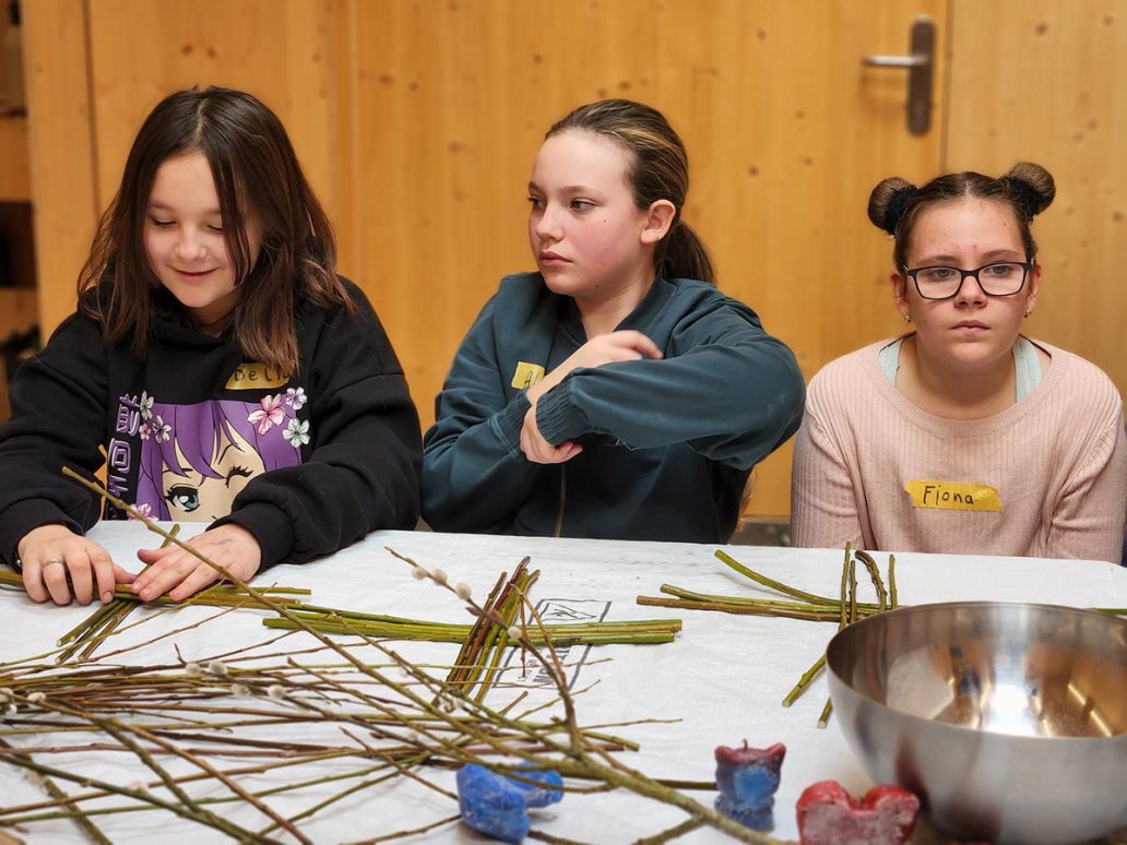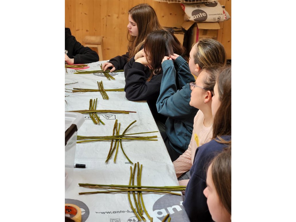 Im offenen Atelier, das jeden Mittwoch in der 8. bis 10. Stunde seine Türen öffnet, bereiten wir gerade die Böden für Weidenkörbe und uns schonmal auf Ostern vor.