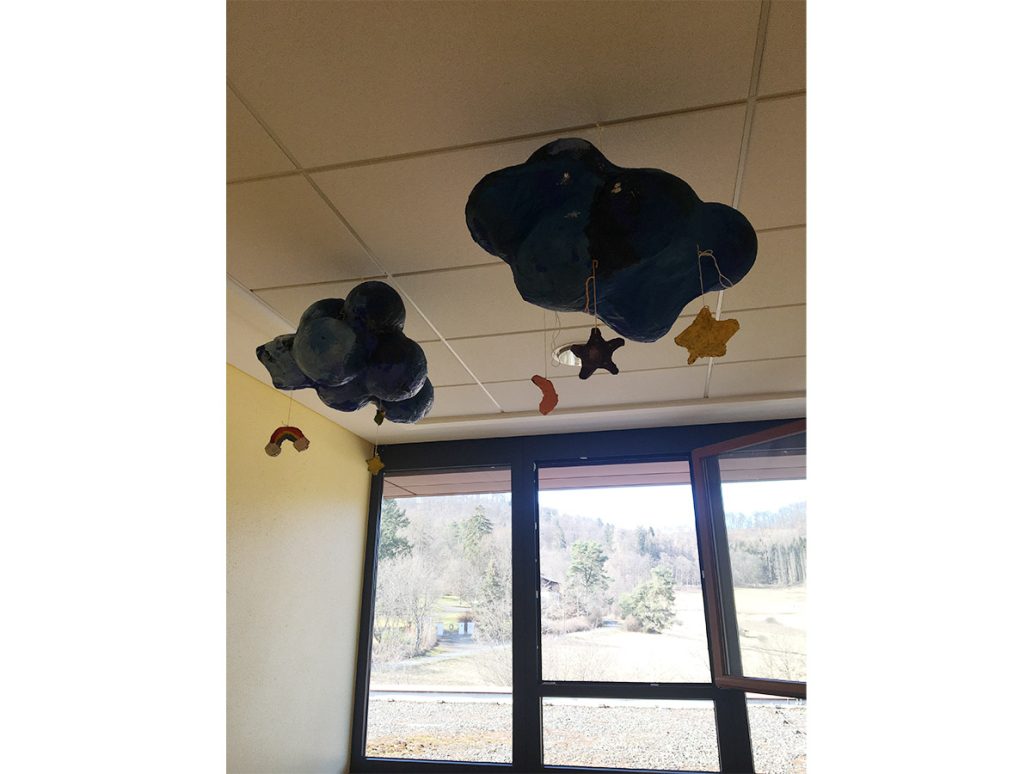 Die Wolken des Nachmittagsangebots „Kreativ“ hängen nun im 3. Obergeschoss der Schule.