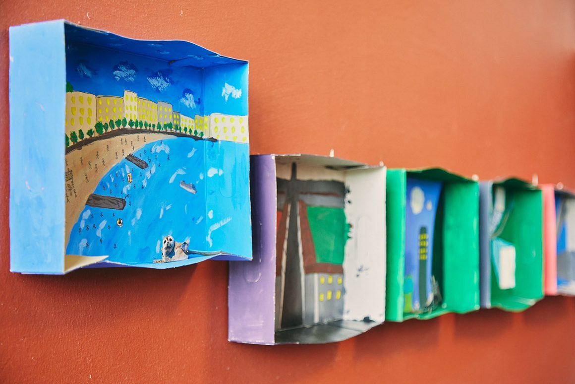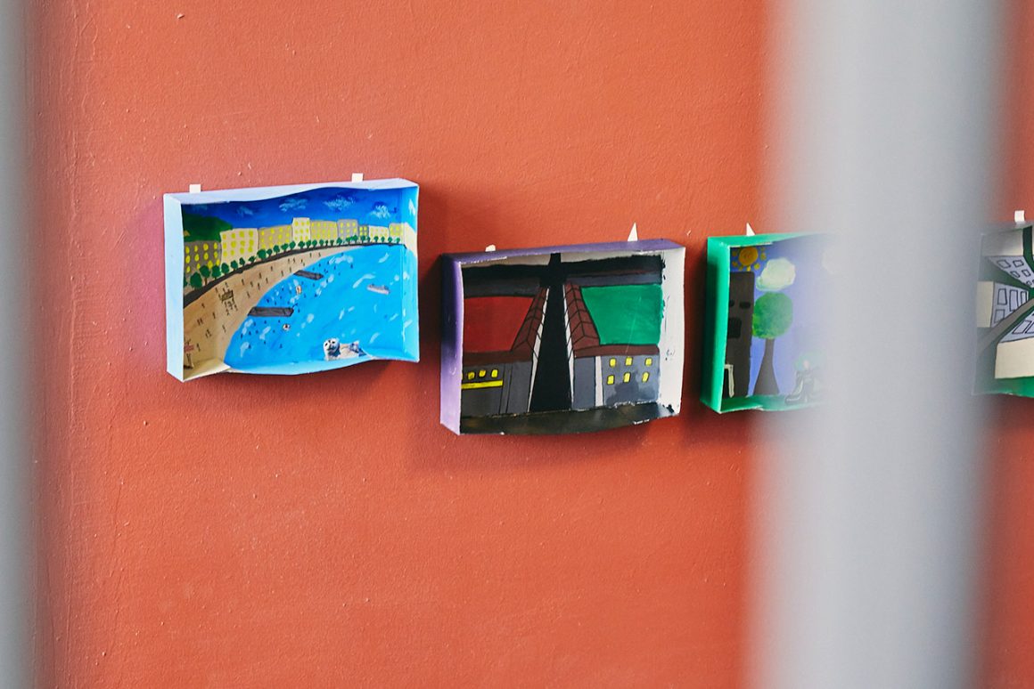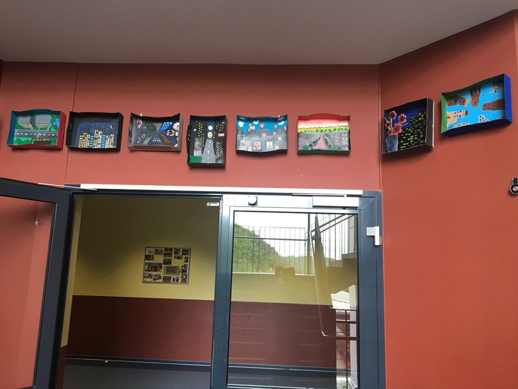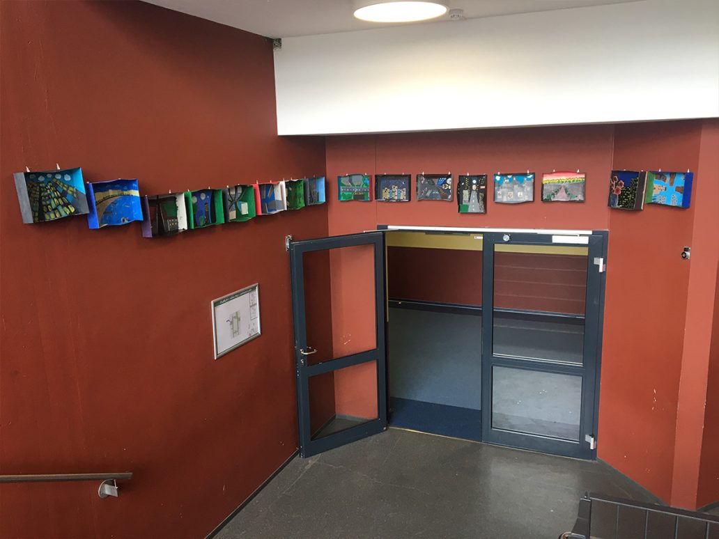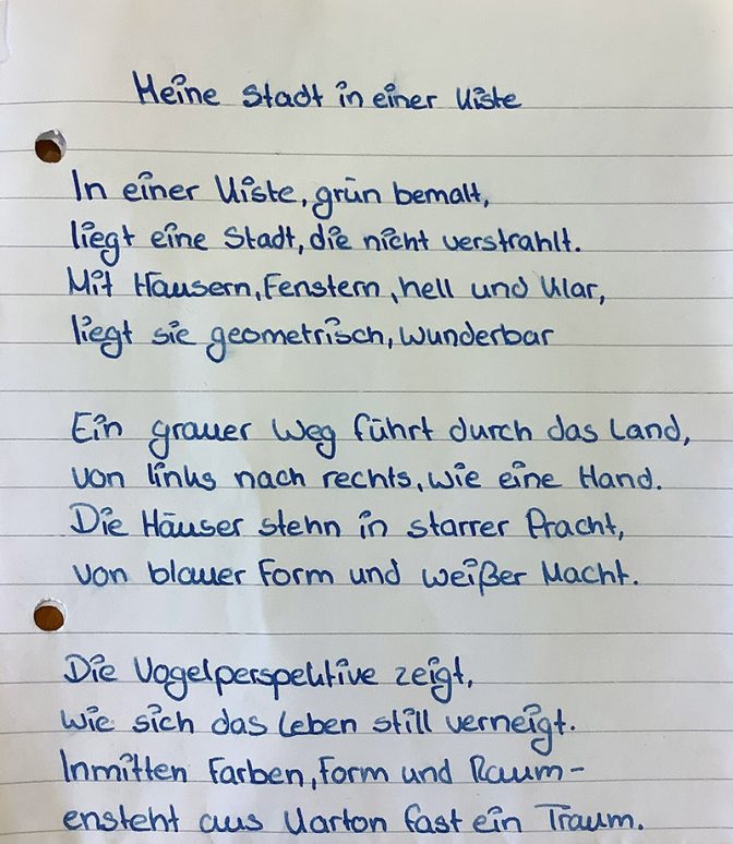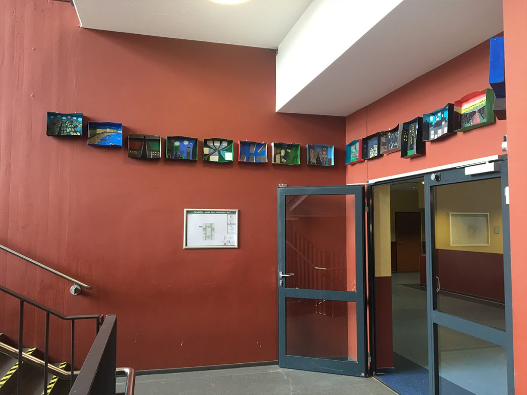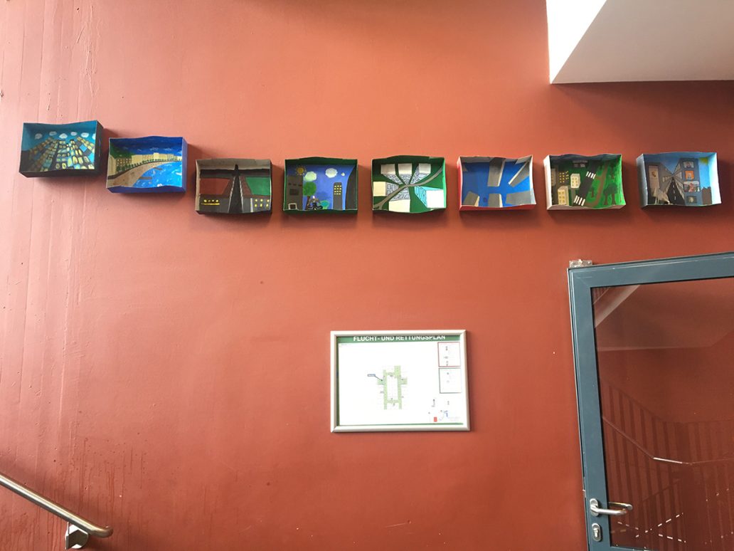 Mit der G8B von Frau Henze entwickelten wir zur Unterrichtseinheit „Stadtlyrik“ perspektivische Stadtansichten, die nun im Treppenhaus im ersten OG der Gesamtschule Battenberg hängen.