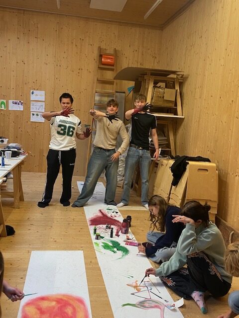 Schnell entstand in der Gruppe die Idee, eine gemeinsame Demonstration zu organisieren. Dafür wurde auf großen Plakaten gemalt und gepinselt und überlegt, welche Botschaften die Schülerinnen und Schüler der Gruppe auf die Plakate schreiben möchten. Eine konzentrierte, aber ausgelassene Stimmung entstand. Nach den Herbstferien wird die Gruppe weiter an diesem Projekt arbeiten.