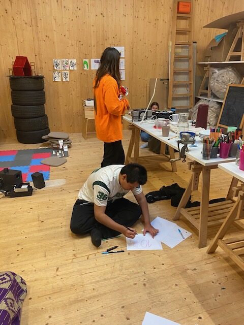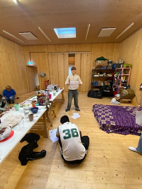 Neugierig betraten die Schülerinnen und Schüler des WPU-Kurses 9/10-Schulgestaltung das fliegende Künstler:innenzimmer und knüpften an dem Tag den ersten Kontakt zu unserer Künstlerin Sopo.