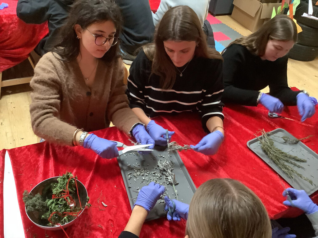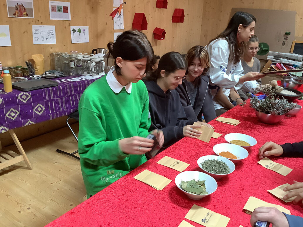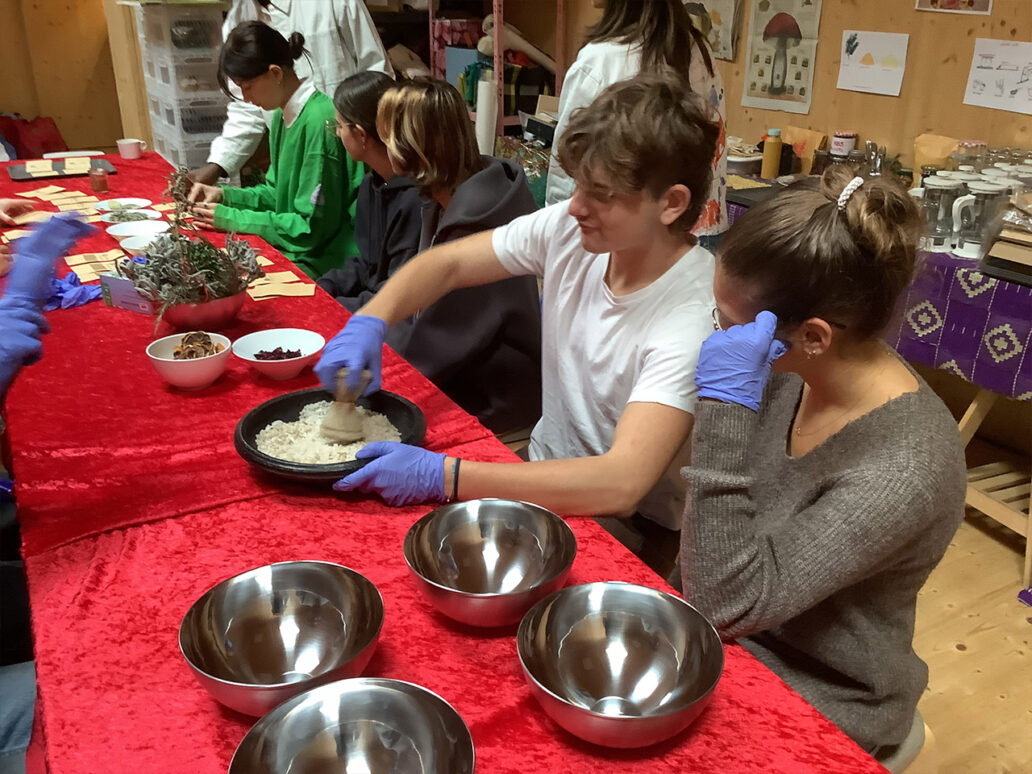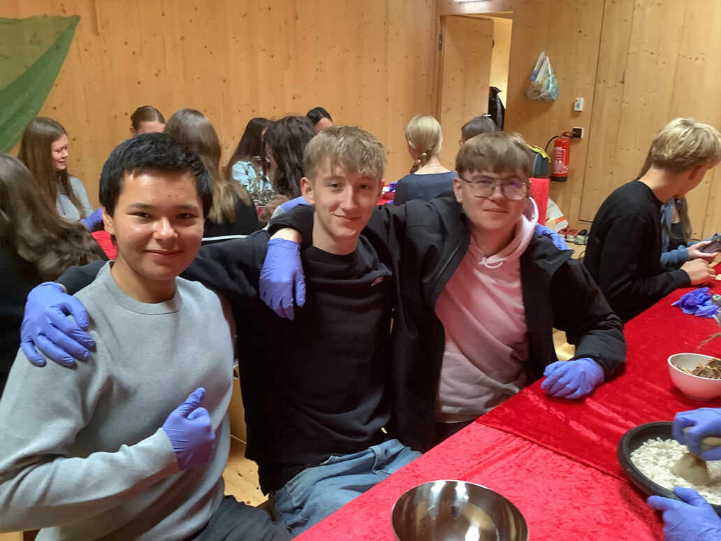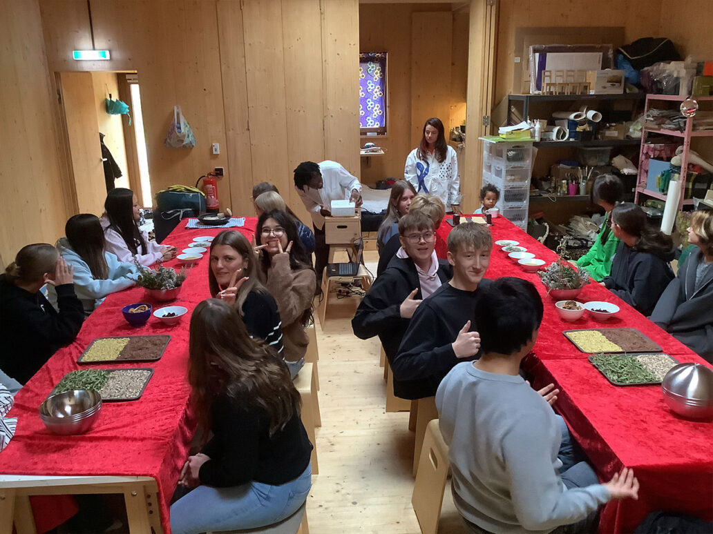 Es wurde geschnitten, zerrieben und im Mörser zerstoßen und anschließend konnte jede:r seine eigene Gewürzmischung abfüllen und mit nach Hause nehmen. Bei den Tees wurden verschiedene Geschmacksrichtungen gemischt, die die Schülerinnen und Schüler untereinander anboten und probierten. Ein reger Austausch fand in der Gruppe statt, eine gemeinschaftliche, feierliche Stimmung entstand. Die Jugendlichen sind beim nächsten Workshop gerne wieder dabei.