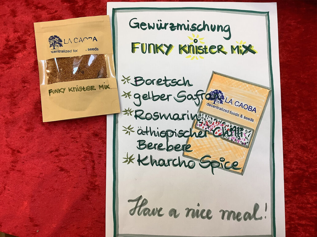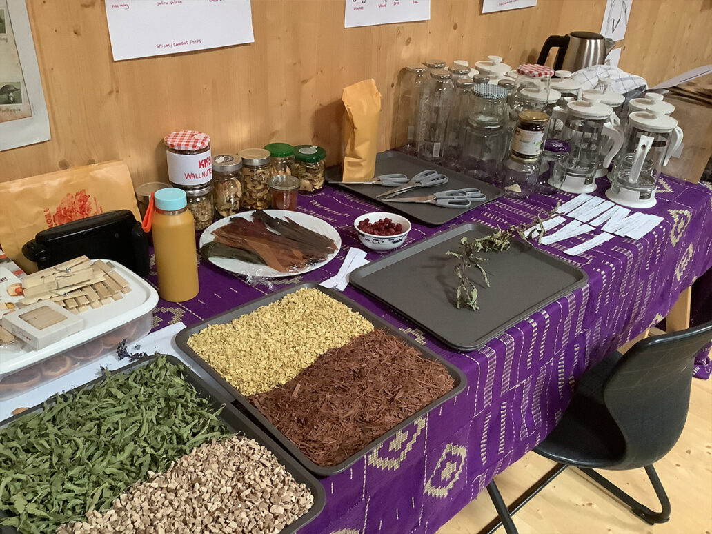 Erdsalz, Kräuter, Wurzeln, Blüten und getrocknete Früchte lagen bereit zur Weiterverarbeitung durch die Schülerinnen und Schüler für eigene Gewürzmischungen und Tees. Der Duft der einzelnen Komponenten durchströmte das FlieKü. Süßholz, Rosmarin, Boretschblüten, Salbei, getrocknete Äpfel und Beeren und vieles mehr waren den Schülerinnen und Schülern teilweise bekannt, teilweise unbekannt.