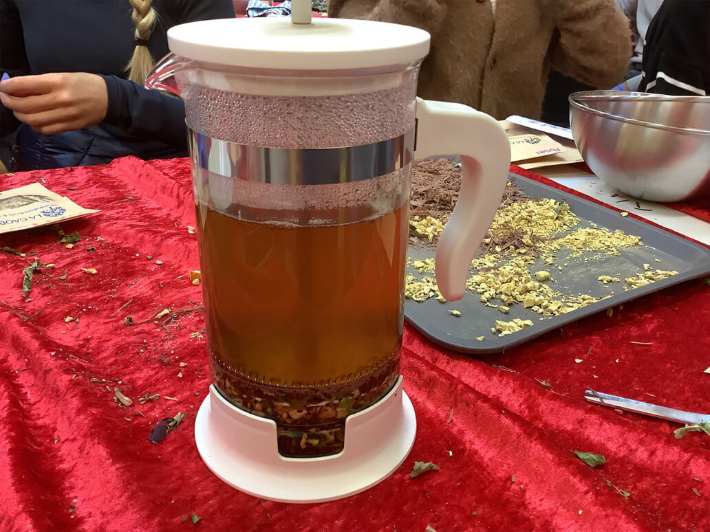 Die Zutaten wurden unter anderem im Schulgarten der Käthe-Kollwitz-Schule gesammelt und getrocknet, aber auch weitere Bestandteile aus aller Welt standen zur Verfügung, damit die Schülerinnen und Schüler ihre eigene Mischung riechen, schmecken und ausprobieren konnten.