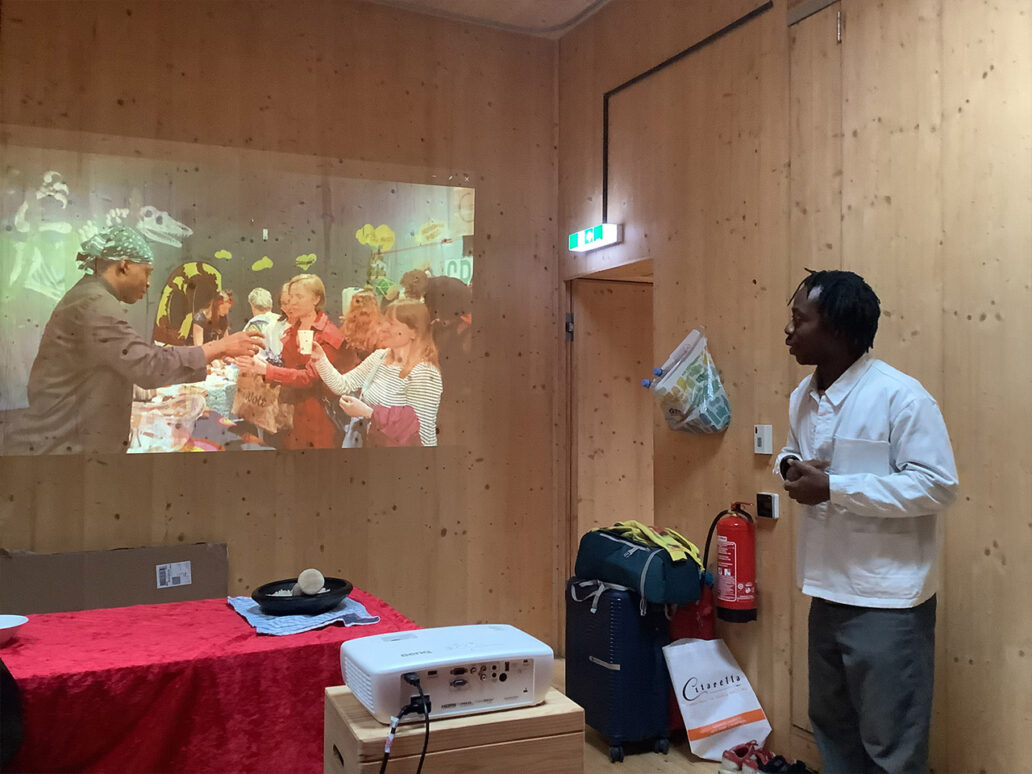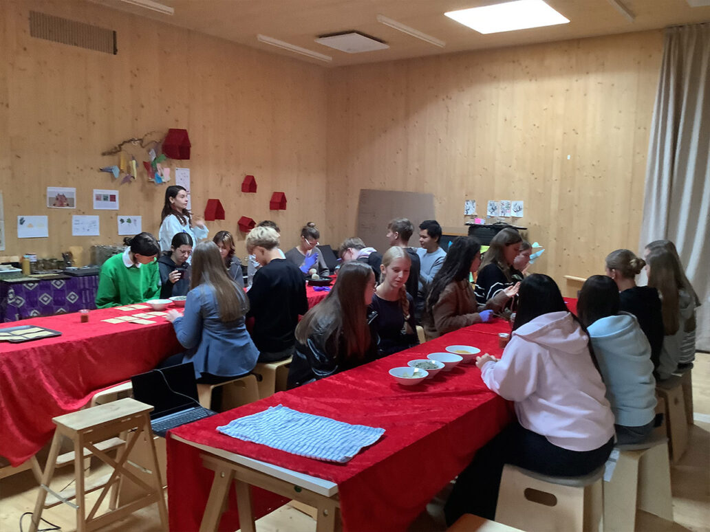 Zwei gemeinsame lange Tische inmitten des fliegenden Künstler:innenzimmers – ein mit Schülerinnen und Schülern aus 9/10 gefülltes Zimmer, ein lebendiger Ort des Austauschs, eine fröhliche Gemeinschaft – so lässt sich in kurzen Worten der gemeinsame Workshop mit dem Künstlerehepaar Sopo und Larry beschreiben.