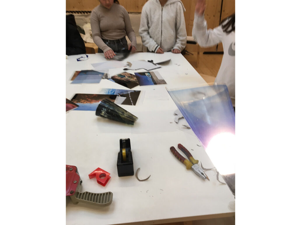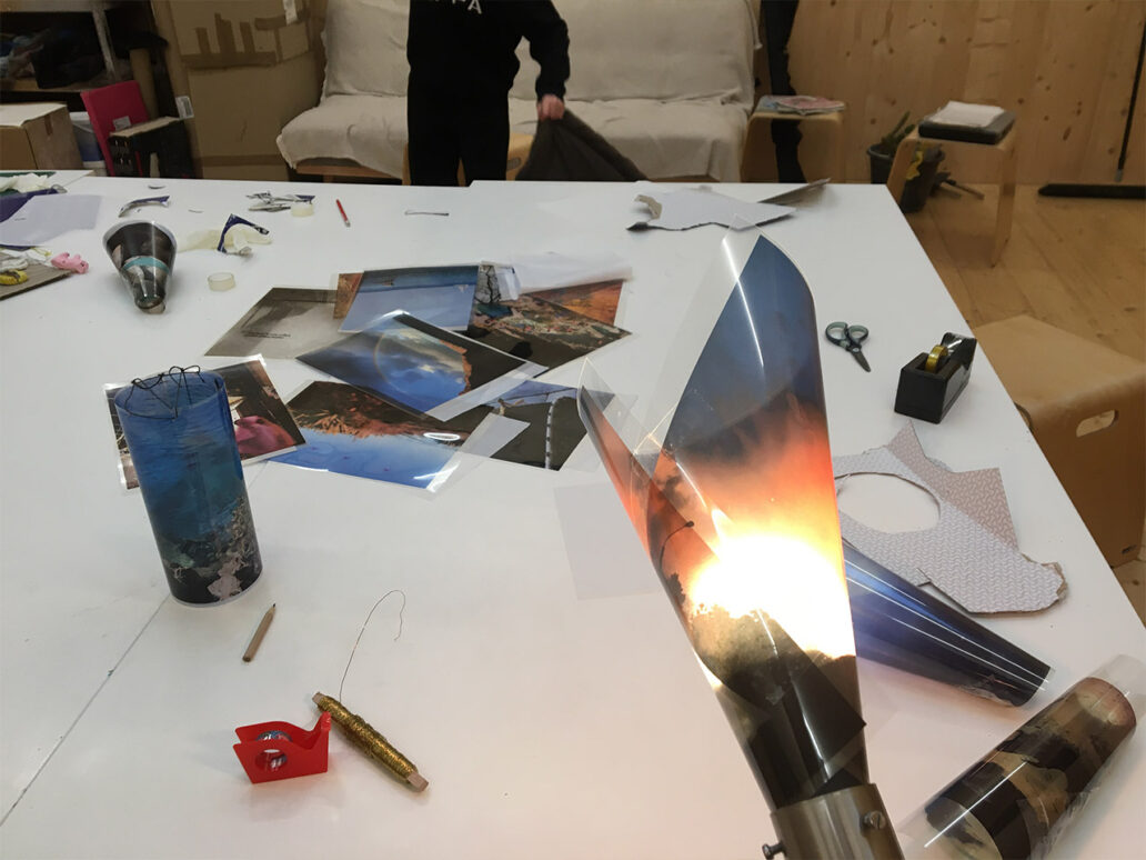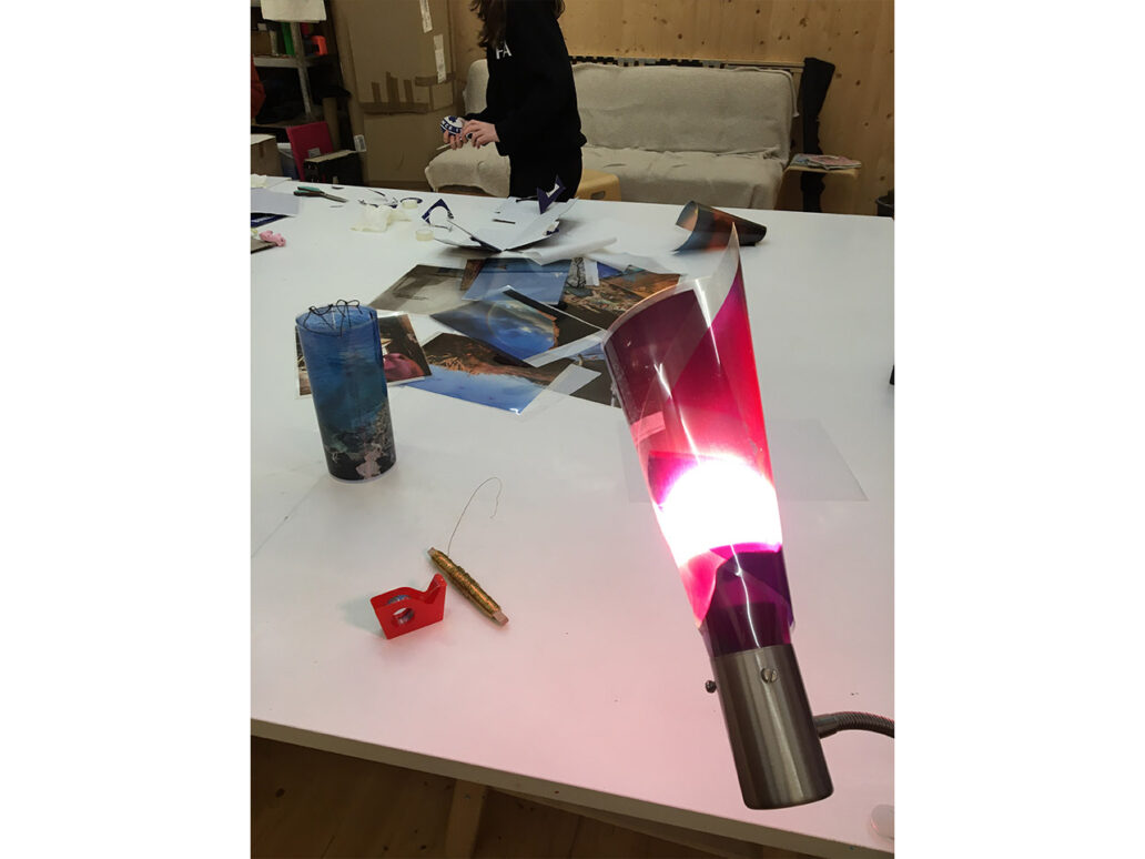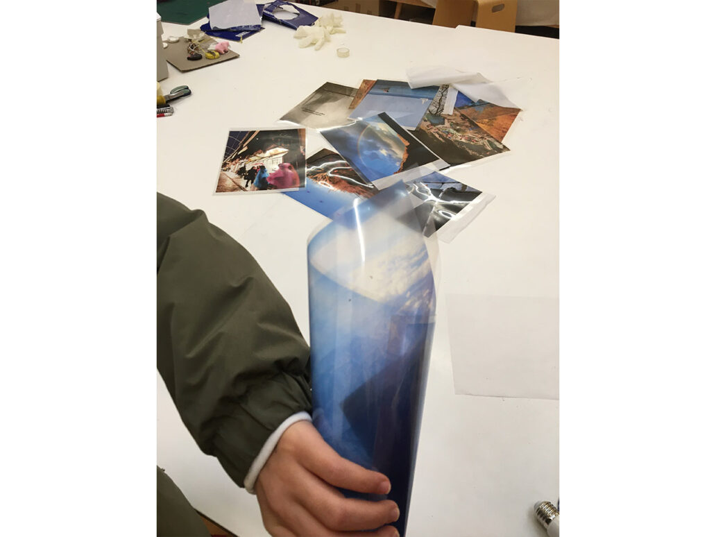 Zum Lampenschirmbau wurden Folien mit Fotos bedruckt und zu bunten Lampenschirmen geformt und verklebt.
