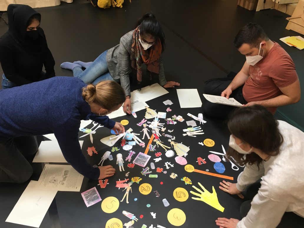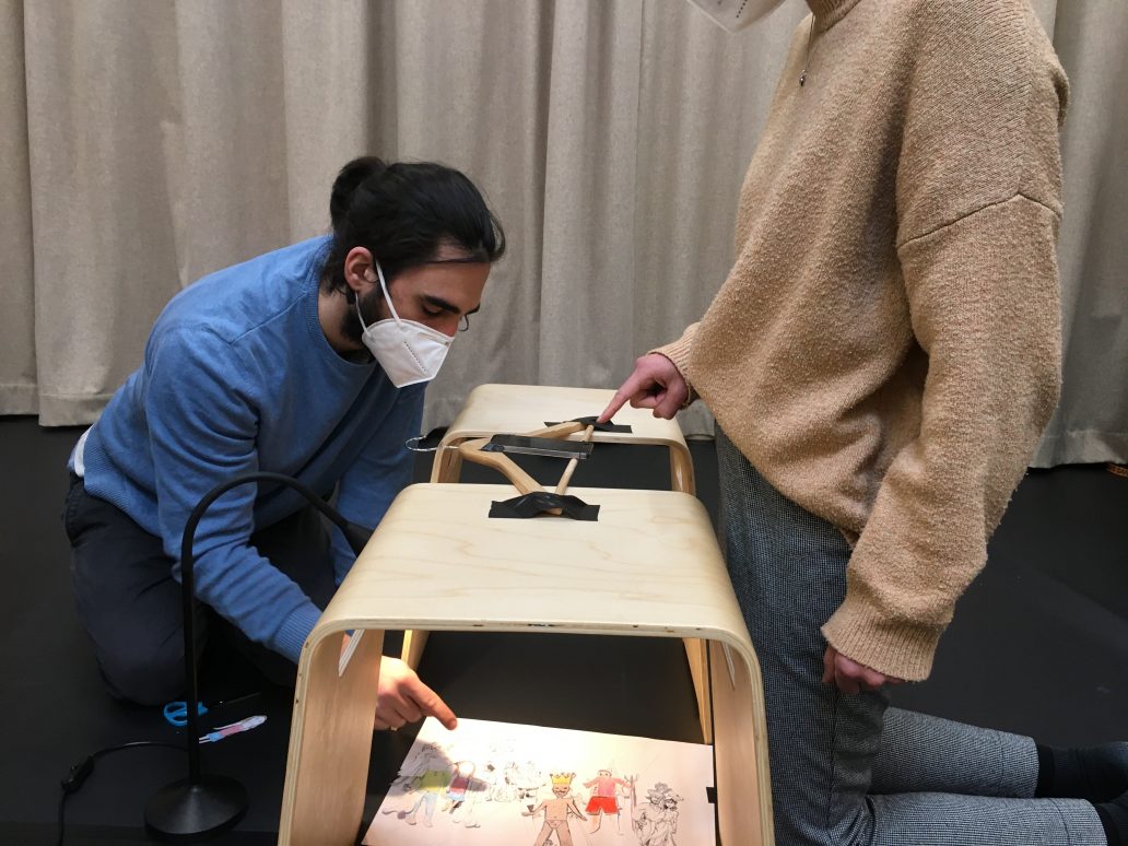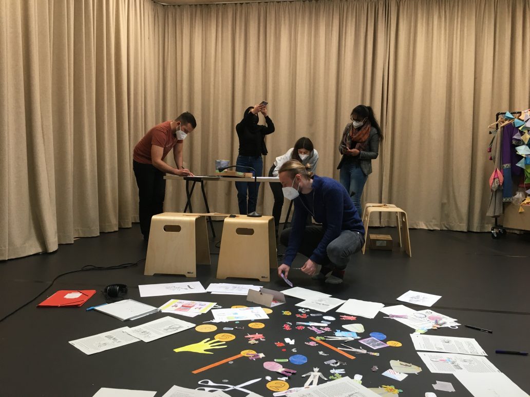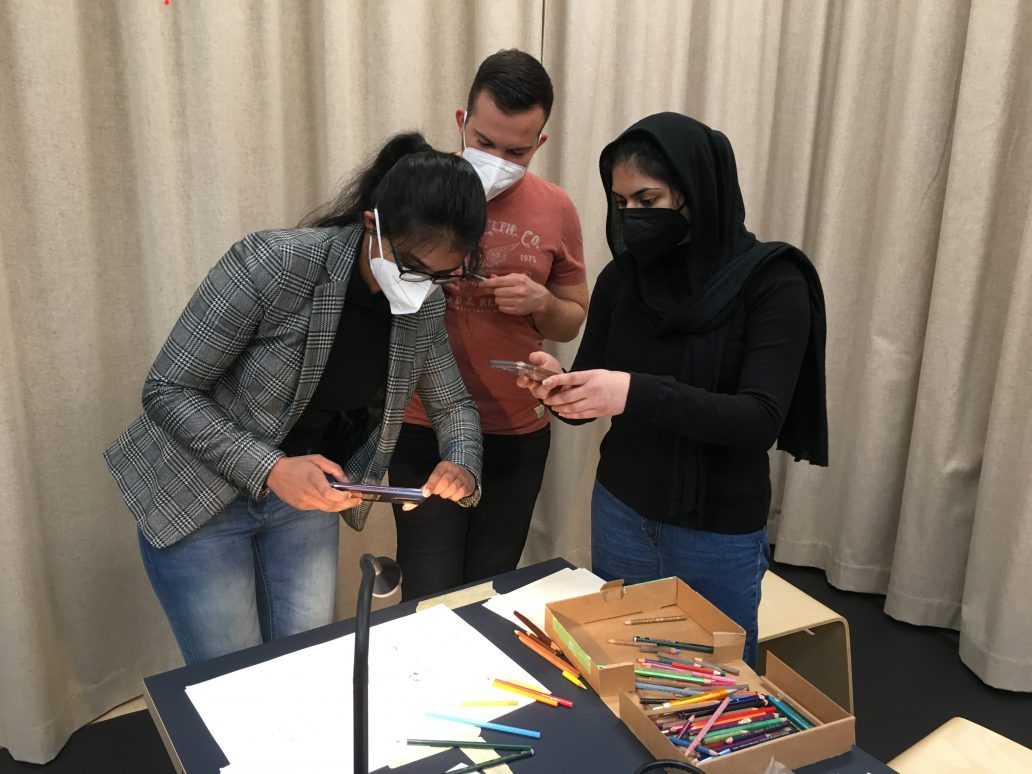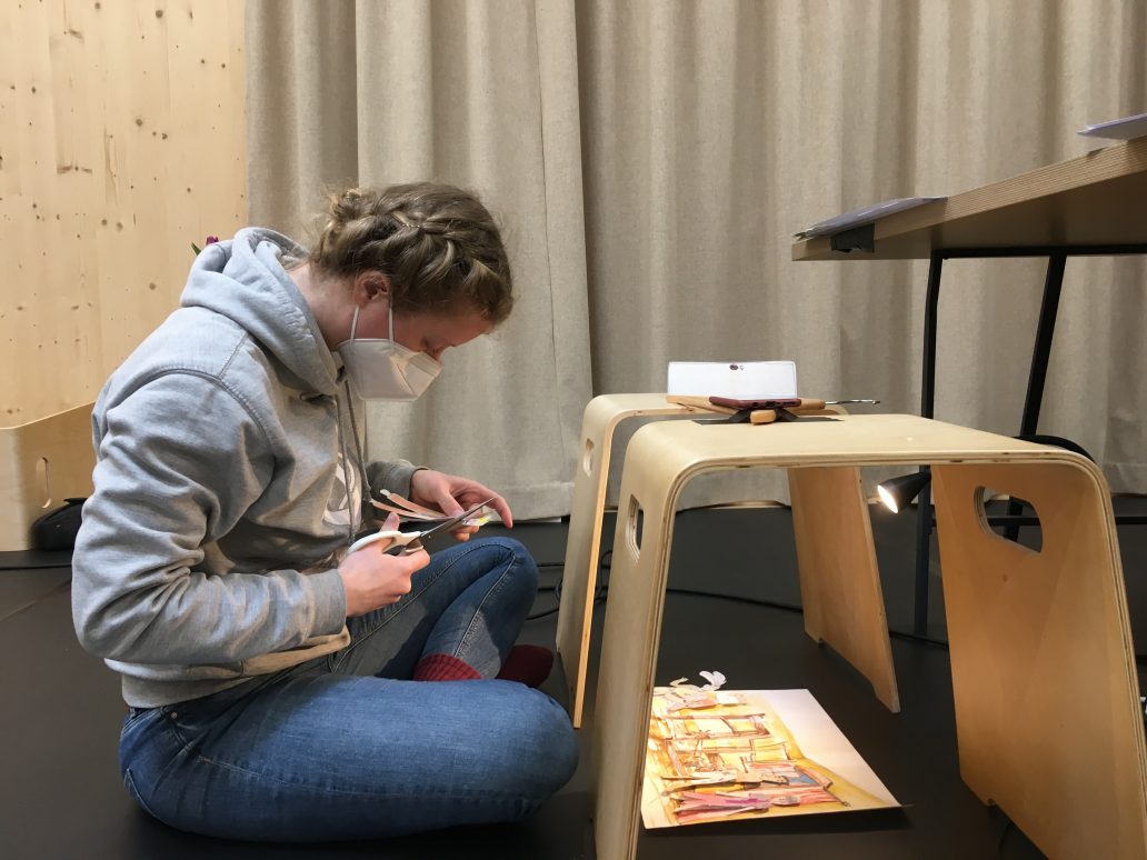 Nach einer freundlichen Begrüßung dürfen wir sofort mitmachen. Zeichnen, schneiden, fotografieren, Fragen stellen. Auf einmal ist es zwölf. Mittlerweile scheint die Sonne durch die zwei Fenster. Ist aber eigentlich egal, die Außenwelt wirkt gerade uninteressant. Wir basteln weiter. Es ist 11 Uhr. Die Zeit ist um. Wir fragen Lisa, ob es allen so geht wie uns mit Corona.“
