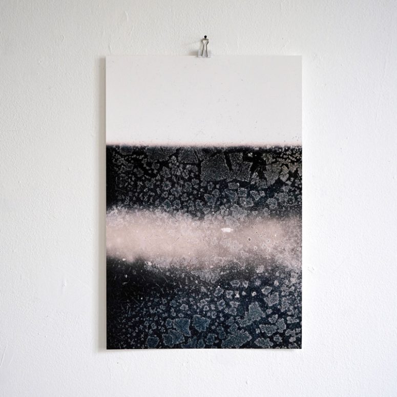 Analogue film is decomposed using chemistry. Without the use of a camera or light, this chemical process produces abstract images that question and resolve photography as a medium. Developed over many years, her experimental process plays with the random nature of chemical decomposition.