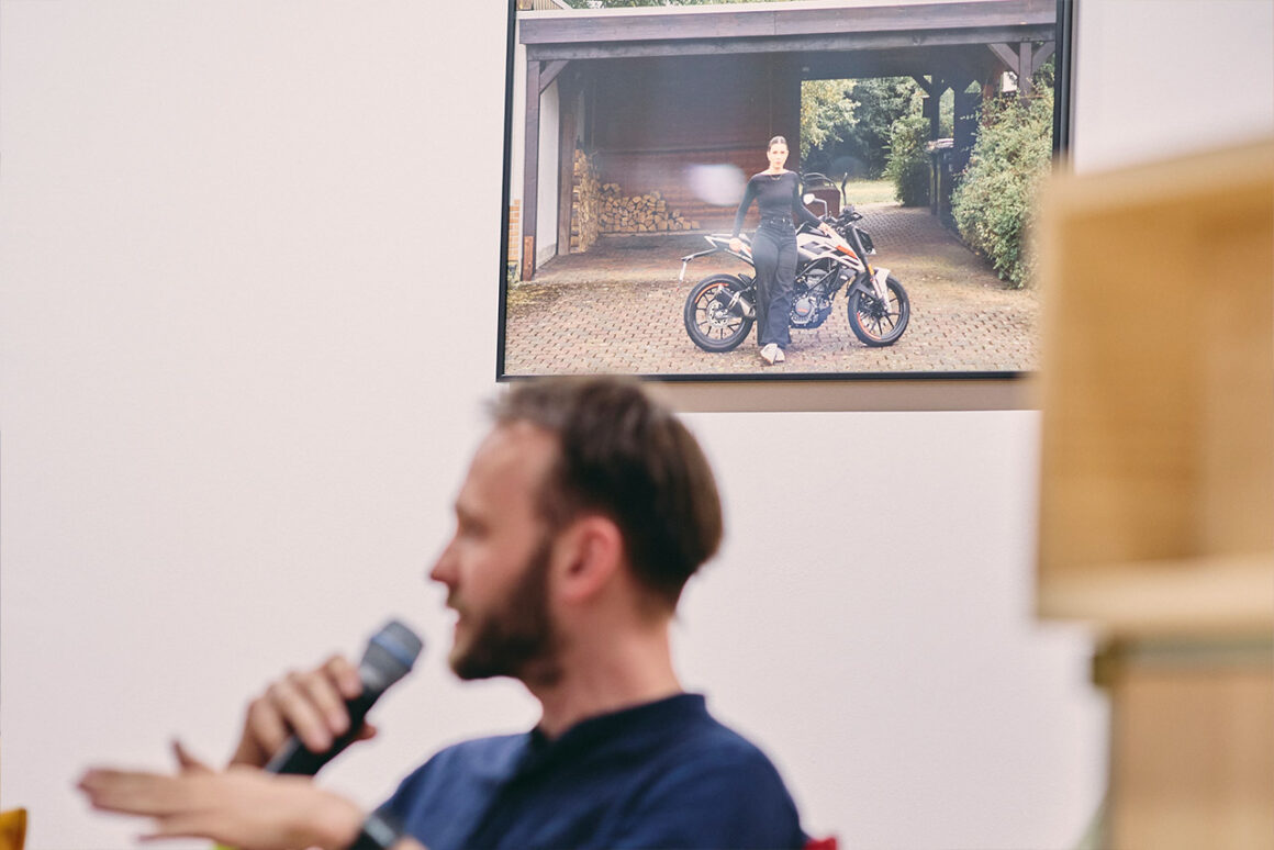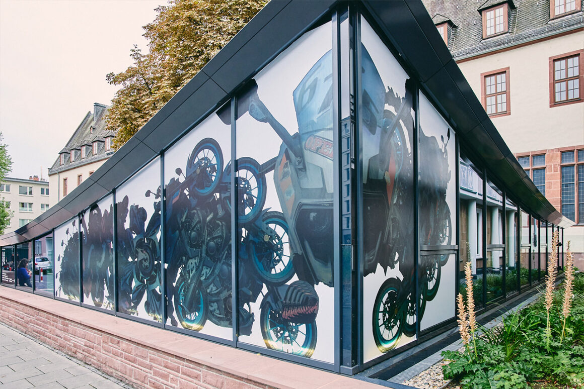 Im Fenster nebenan sind Collagen von Motorrädern und Mopeds zu entdecken. Die ortsspezifische Arbeit von Dawid Liftinger, entstanden in Zusammenarbeit mit den Schüler:innen der Walter-Lübcke-Schule in Wolfhagen, beschäftigt sich mit Mobilität aus der Perspektive junger Menschen. Mobilität bedeutet dabei nicht nur Fortbewegung, sondern auch Freiheit und Teilhabe an verschiedenen Lebensräumen. Die Jugendlichen bringen dabei ihre individuellen Erfahrungen ein – geprägt von familiären Hintergründen und den Gegebenheiten vor Ort. In den entstandenen Collagen verdichten sich diese Perspektiven zu einem Bild, das Fragen nach Zugänglichkeit und Unabhängigkeit aufwirft.