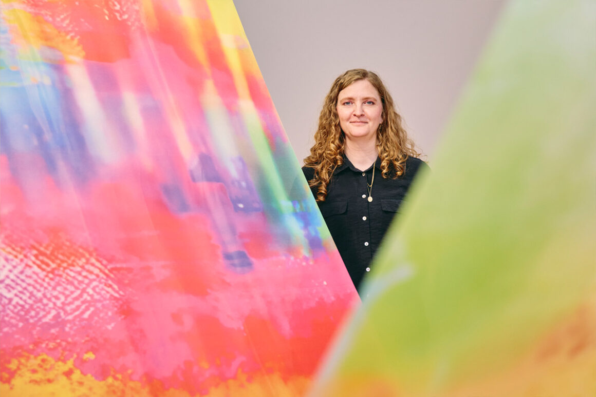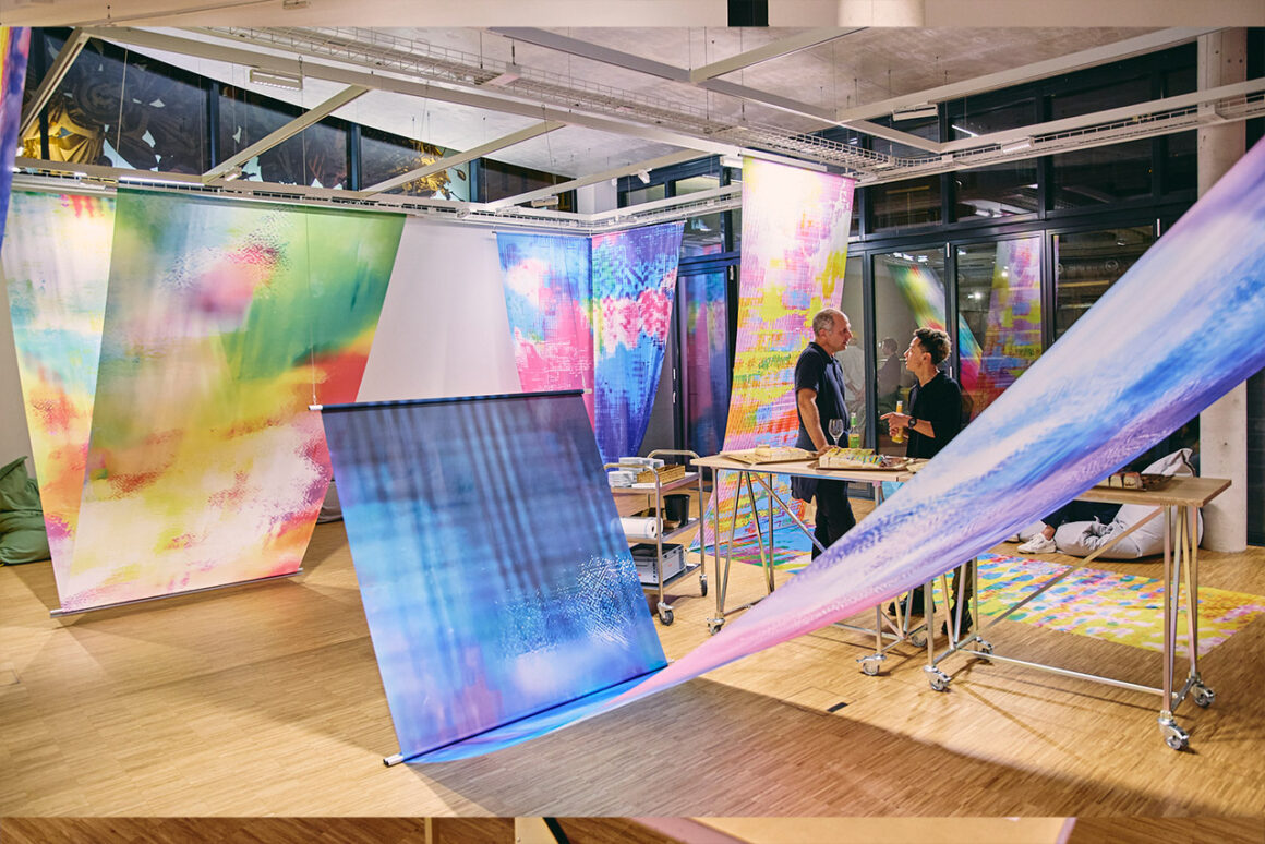 Ergänzt wird die Ausstellung durch eine kollaborative Arbeit, in der Wurster den Schüler:innen ihren künstlerischen Prozess der digitalen Zersetzung von Videomaterial zugänglich machte. Auf gemeinsamen Wanderungen entlang der Nidda sammelten sie Fotomaterial, das sie in Schichten überlagerten, bis nur noch abstrakte Formen und Farben sichtbar blieben. Diese Abstraktionen wurden schließlich auf Fahnen gedruckt – ein Prozess, der die Aufmerksamkeit der Schüler:innen auf das Erleben und Gestalten lenkte, statt auf ein konkretes Ergebnis.